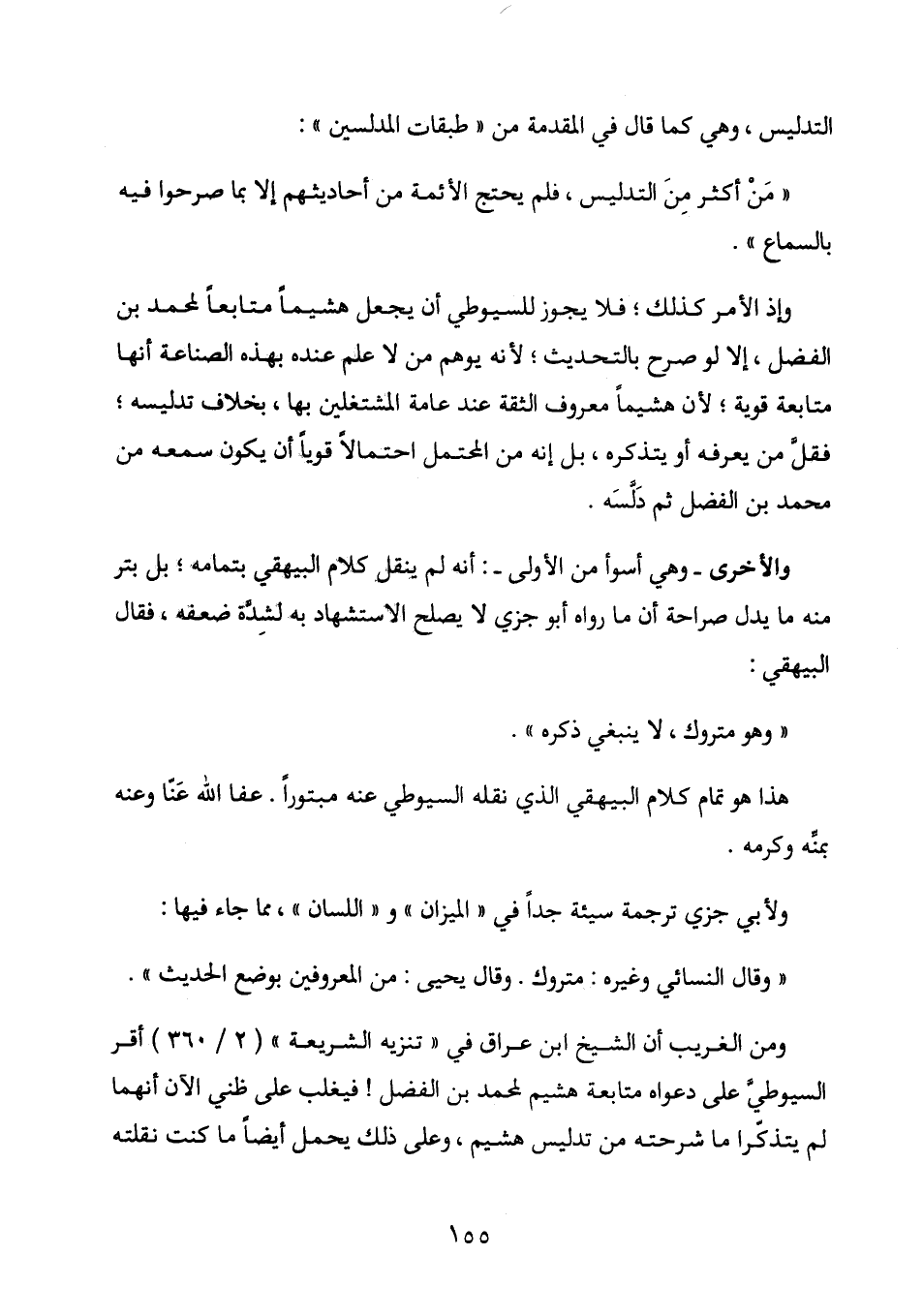 وإذا الأمر كذلك؛ فلا يجوز للسيوطي أن يجعل هشيماً متابعاً لمحمد بن الفضل، إلا لو صرح بالتحديث؛ لأنه يوهم من لا علم عنده بهذه الصناعة أنها متابعة قوية؛ لأن هشيماً معروف الثقة عند عامة المشتغلين بها بخلاف تدليسه؛ فقلّ من يعرفه أو يتذكره، بل إنه من المحتمل احتمالاً قوياً أن يكون سمعه من محمد بن الفضل ثم دَلَّسَه.