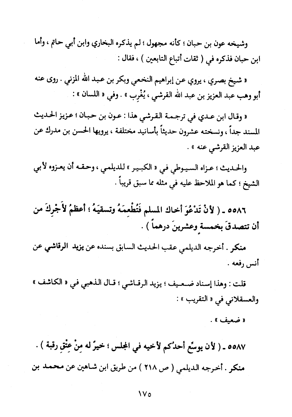5586 - (لَأَنْ تَدْعُوَ أَخَاكَ الْمُسْلِمَ فَتُطْعِمَهُ وَتَسْقِيَهُ؛ أَعْظَمُ لِأَجْرِكَ مِنْ أَنْ تَتَصَدَّقَ بِخَمْسَةٍ وَعِشْرِيْنَ دِرْهَمًا)