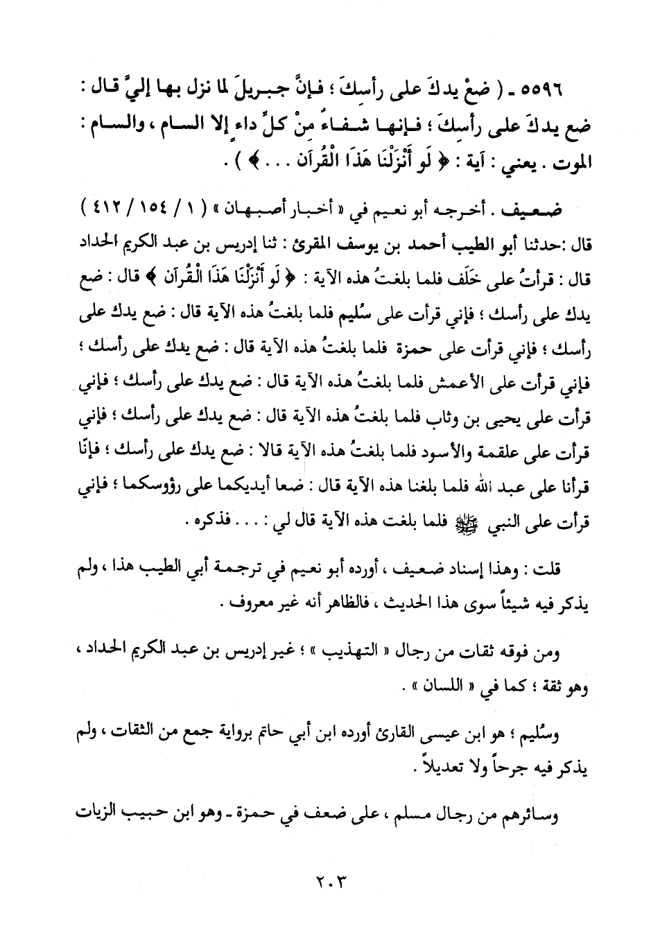 5596 - (ضع يديك على رأسك، فإن جبريل لما نزل بها إلي قال: ضع يديك على رأسك، فإنها شفاء من كل داء إلا السام، والسام: الموت. يعني: آية: (لو أنزلنا هذا القرآن. . .)) .