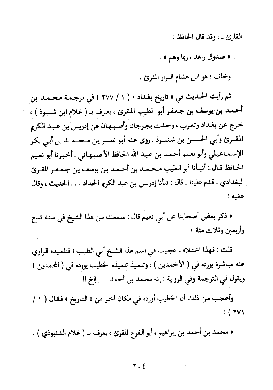 قلت: فهذا اختلاف عجيب في اسم هذا الشيخ أبي الطيب، فتلميذه الراوي عنه مباشرة يورده في (الأحمدين) ، وتلميذ تلميذه الخطيب يورده في (المحمدين) ويقول في الترجمة وفي الرواية: إنه محمد بن أحمد. . . الخ! !