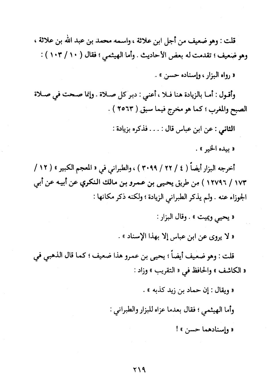 قلت: وهو ضعيف من أجل ابن علاثة، واسمه محمد بن عبد الله بن علاثة، وهو ضعيف؛ تقدمت له بعض الأحاديث. وأما الهيثمي؛ فقال: (10 / 103) : (رواه البزار، وإسناده حسن) .