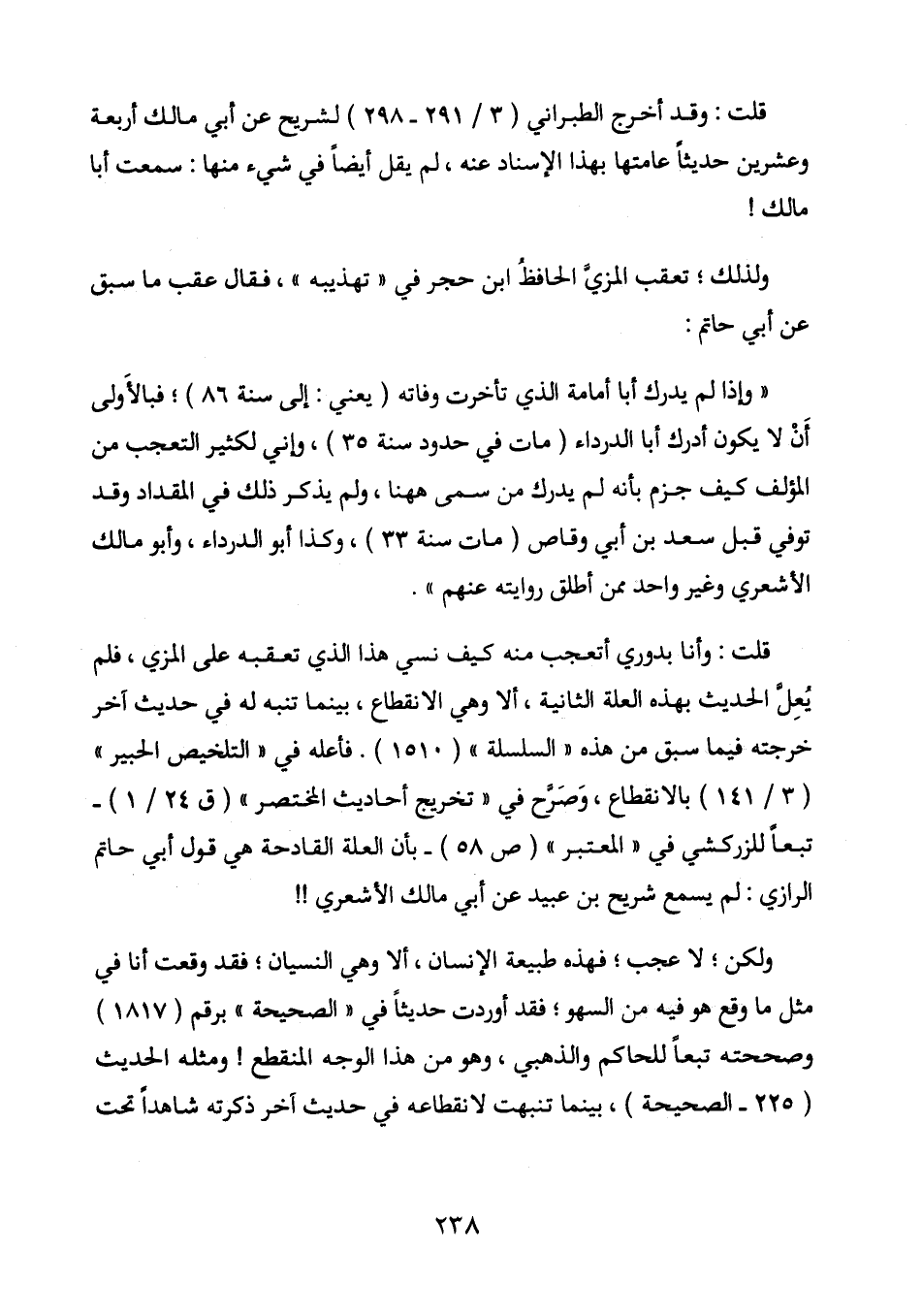 قلت: وقد أخرج الطبرانى (3 / 291 - 298) لشريح عن أبى مالك أربعة وعشرين حديثا عامتها بهذا الإسناد عنه، لم يقل أيضا فى شىء منها: سمعت أبا مالك!
