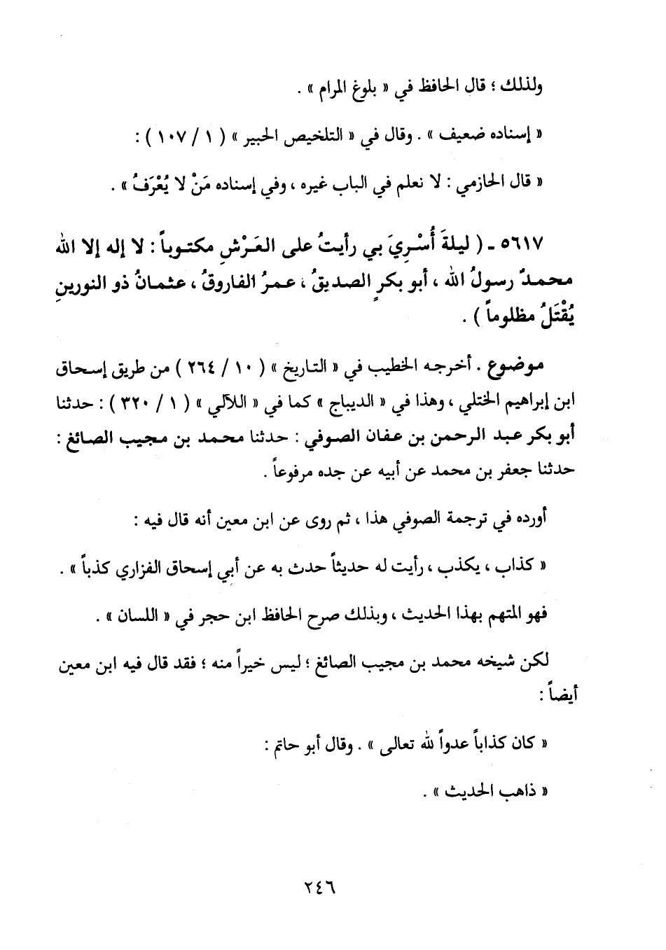 5617 - (ليلة أسري بي رأيت على العرش مكتوباً: لا إله إلا الله محمد رسول الله، أبو بكر الصديق، عمرُ الفاروقُ، عثمانُ ذو النورين، يُقتَلُ مظلوما) .