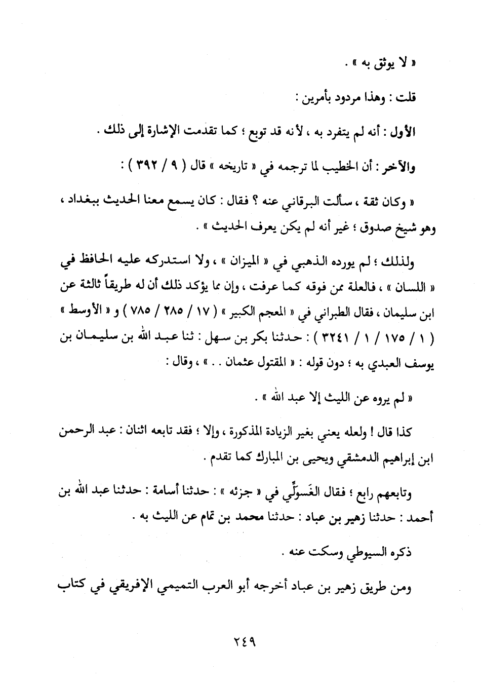 ولذلك؛ لم يورده الذهبي في ((الميزان)) ، ولا استدركه عليه الحافظ في ((اللسان)) ، فالعلة ممن فوقه كما عرفت، وإن مما يؤكد ذلك أن له طريقاً ثالثة عن ابن سليمان، فقال الطبراني في ((المعجم الكبير)) (17 / 285 / 785) و ((الأوسط)) (1 / 175 / 1 / 3241) : حدثنا بكر بن سهل: ثنا عبد الله بن سليمان بن يوسف العبدي به؛ دون قوله: ((المقتول عثمان. .)) ، وقال: