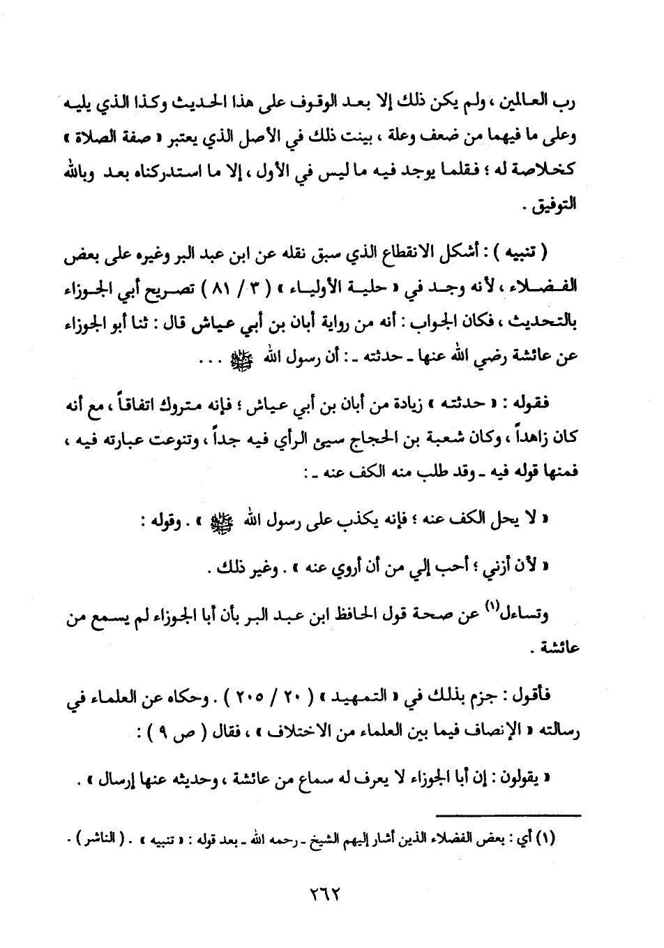 (تنبيه) : إشكل الانقطاع الذي سبق نقله عن ابن عبد البر وغيره على بعض الفضلاء، لأنه وجد في «حلية الأولياء» (3 / 81) تصريح أبي الجوزاء بالتحديث، فكان الجواب: أنه من رواية أبان بن أبي عياش قال: ثنا أبو الجوزاء عن عائشة رضي الله عنها - حدثته -: أن رسول الله - صلى الله عليه وسلم -. . .