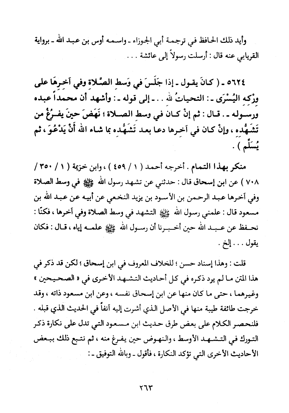 قلت: وهذا إسناد حسن؛ للخلاف المعروف في أبي إسحاق؛ لكن قد ذكر في هذا المتن ما لم يرد ذكره في كل أحاديث التشهد الأخرى في «الصحيحين» وغيرهما، حتى ما كان منها عن ابن إسحاق نفسه، وعن ابن مسعود ذاته، وقد خرجت طائفة طيبة منها في الصل الذي أشرت إليه آنفاً في الحديث الذي قبله. فلنحصر الكلام على بعض طرق حديث ابن مسعود التي تدل على نكارة ذكر التورك في التشهد الأوسط، والنهوض حين يفرغ منه، ثم نتبع ذلك ببعض الأحاديث الأخرى التي تؤكد النكارة، فأقول - وبالله التوفيق -: