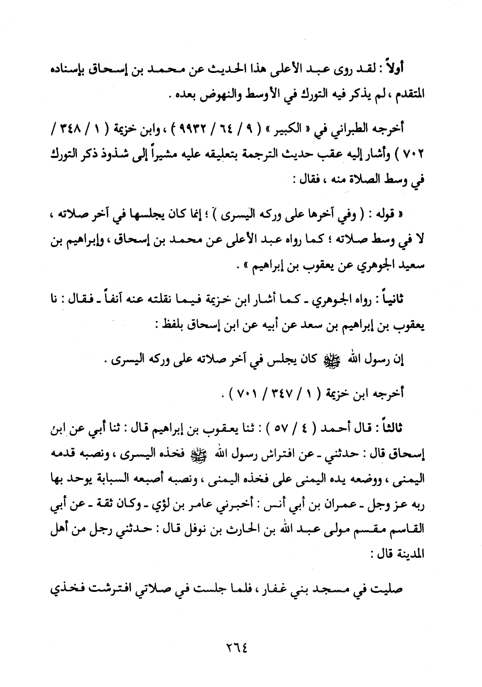 أولا: لقد روى عبد الأعلى هذا الحديث عن محمد بن إسحاق بإسناده المتقدم، لم يذكر فيه التورك في الأوسط والنهوض بعده.