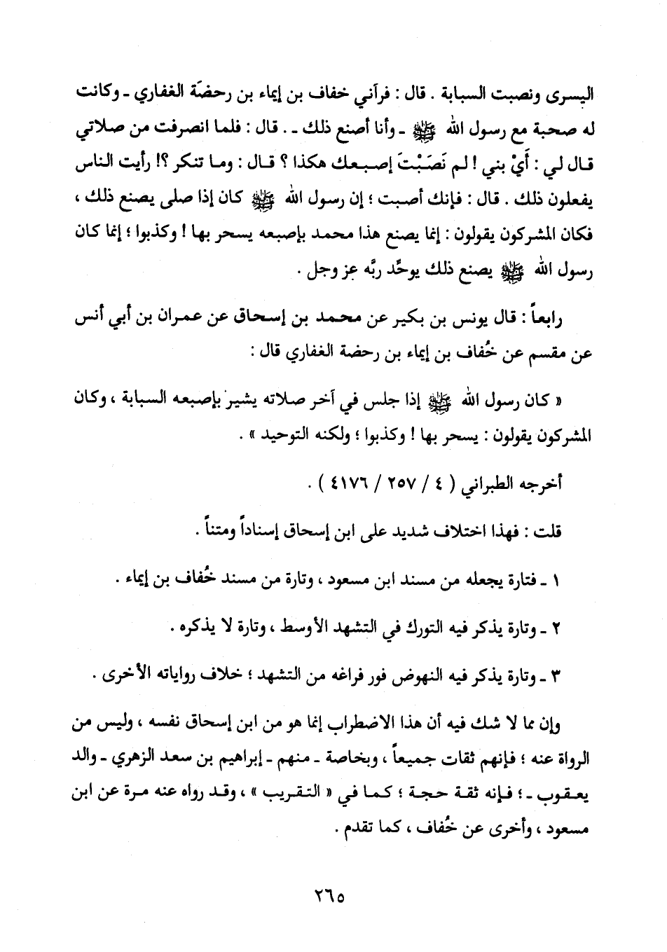 وإن مما لاشك فيه أن هذا الاضطراب إنما هو من ابن إسحاق نفسه، وليس من الرواة عنه؛ فإنهم ثقات جميعاً، وبخاصة - منهم - إبراهيم بن سعد الزهري - والد يعقوب -؛ فإنه ثقة حجة؛ كما في «التقريب» ، وقد رواه عنه مرة عن ابن مسعود، واخرى عن خُفاف، كما تقدم.