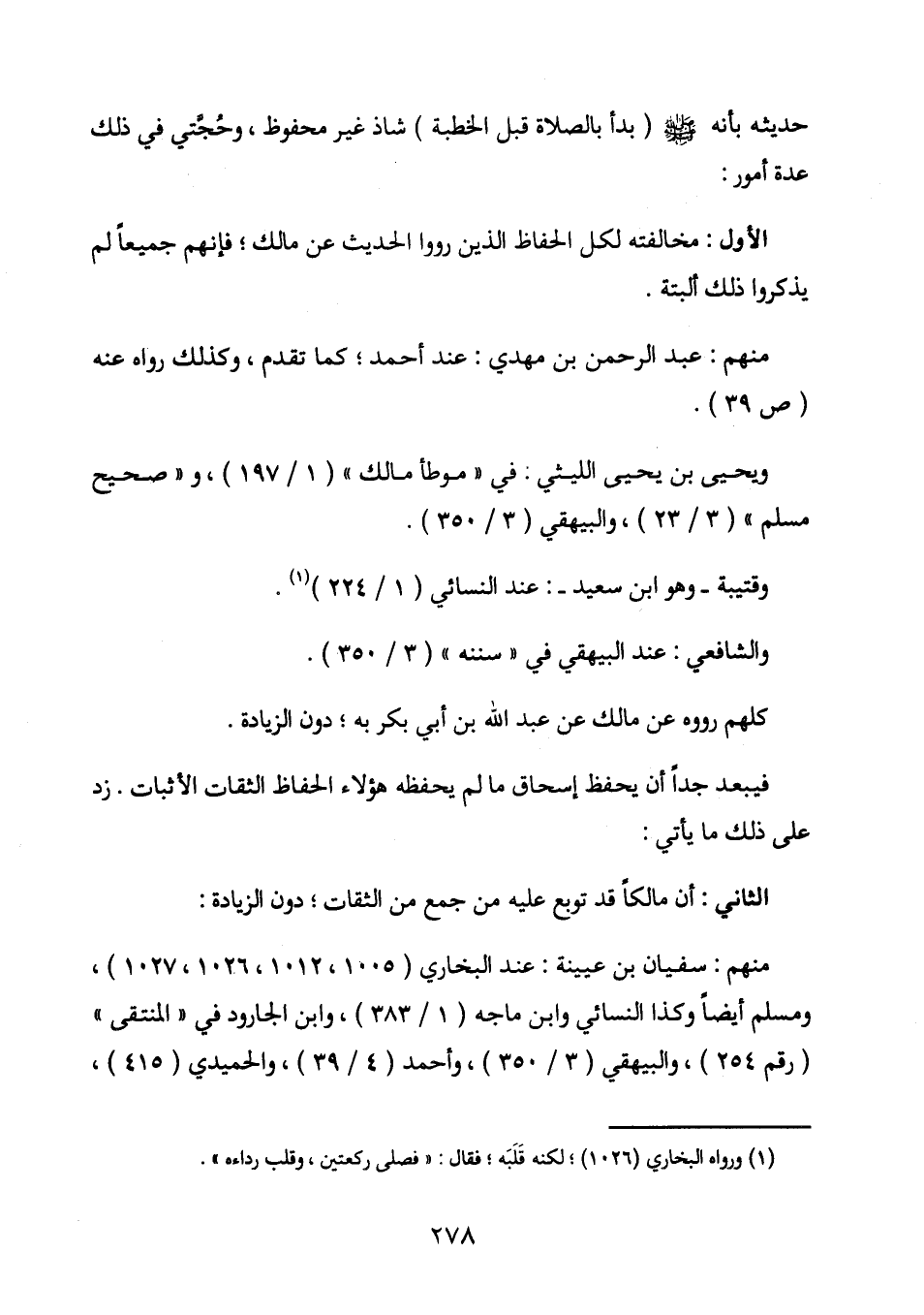 حديثه بأنه صلى الله عليه وسلم (بدأ بالصلاة قبل الخطبة) شاذ غير محفوظ، وحُجَّتي في ذلك