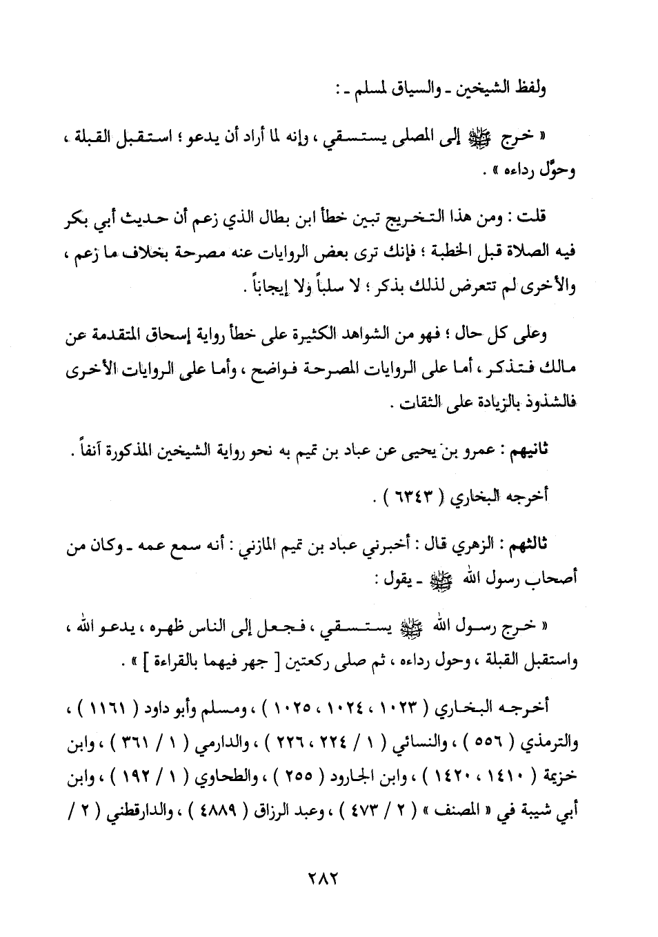 قلت: ومن هذا التخريج تبين خطأ ابن بطال الذي زعم أن حديث أبي بكر فيه الصلاة قبل الخطبة؛ فإنك ترى بعض الروايات عنه مصرحة بخلاف ما زعم، والأخرى لم تتعرض لذلك بذكر؛ لا سلباً ولا إيجاباً.