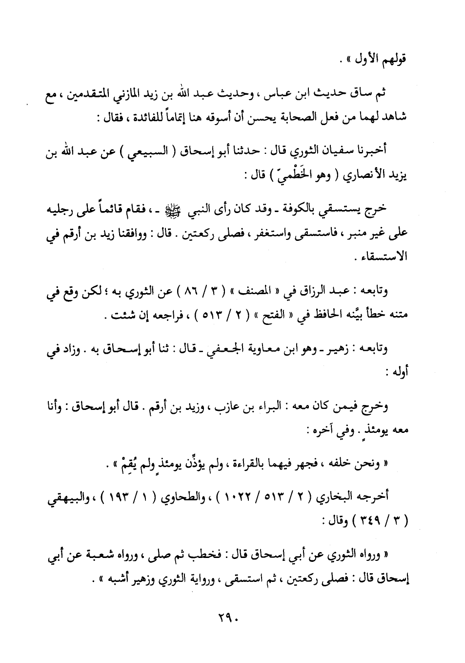 إسحاق قال: فصلى ركعتين، ثم استسقى، ورواية الثوري وزهير أشبه)) .