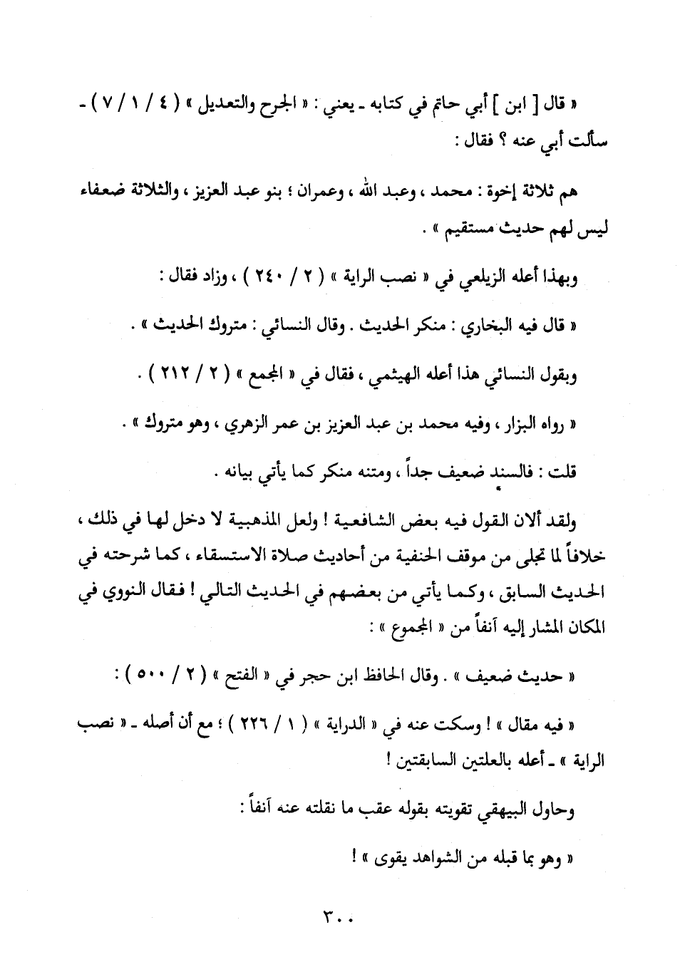 ((قال [ابن] أبي حاتم في كتابه - يعني: ((الجرح والتعديل)) (4 / 1 / 7) - سألت أبي عنه؟ فقال: هم ثلاثة إخوة: محمد, وعبد الله, وعمران؛ بنو عبد العزيز, والثلاثة ضعفاء ليس لهم حديث مستقيم)) .