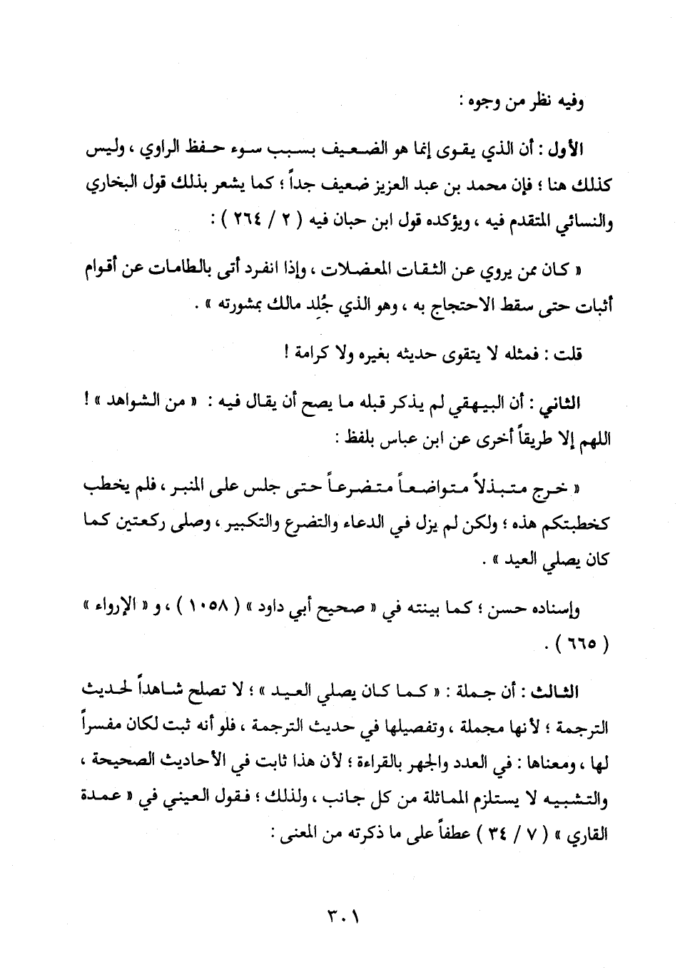 الثاني: أن البهيقي لم يذكر قبله ما يصح أن يقال فيه: ((من الشواهد)) ! اللهم إلا طريقًا أخرى عن ابن عباس بلفظ: ((خرج متبذلاً متواضعًا متضرعًا حتى جلس على المنبر, فلم يخطب كخطبتكم هذه؛ ولكن لم يزل في الدعاء والتضرع والتكبير, وصلى ركعتين كما كان يصلي العيد)) .
