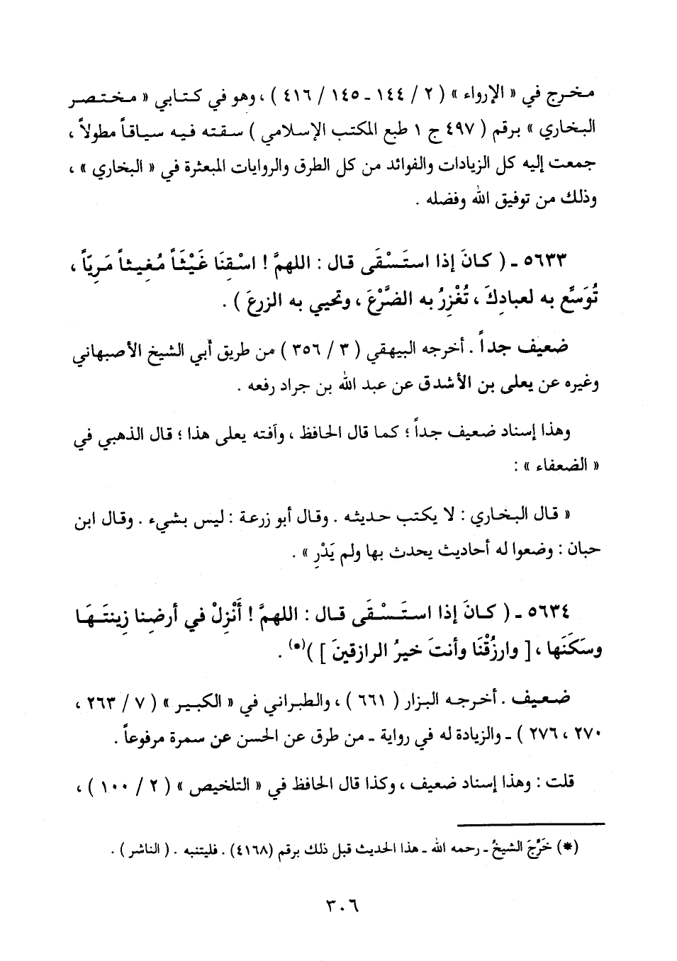 5633 - (كان إذا استسقى قال: اللهم اسقنا غيثًا مغيثًا مريًا, توسع به لعبادك, تغزر به الضرع, وتحيي به الزرع) .