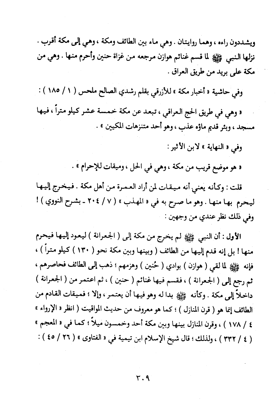 الأول: أن النبي صلى الله عليه وسلم لم يخرج من مكة إلى (الجعرانة) ليعود إليها فيحرم منها! بل إنه قدم إليها من الطائف (وبينها وبين مكة نحو (130)