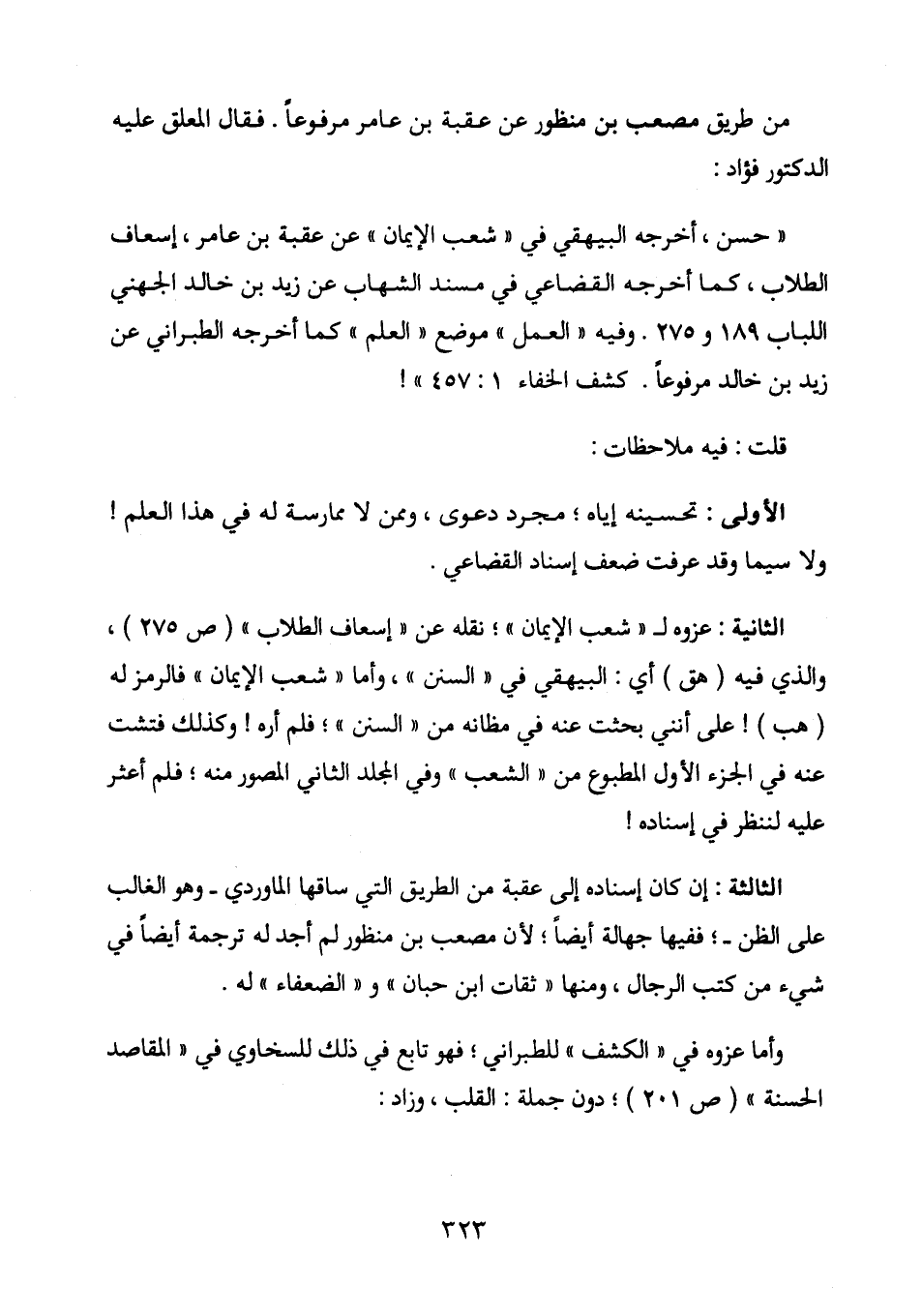 الثانية: عزوه لشعب الإيمان، نقله عن إسعاف الطلاب (ص 275) ، والذي فيه (هق) أي: البيهقي في السنن، وأما شعب الإيمان فالرمز له (هب) ! على أني بحثت عنه في مظانه من السنن فلم أره! وكذلك فتّشت عنه في الجزء الأول المطبوع من الشعب وفي المجلد الثاني المصور منه: فلم أعثر عليه لننظر في إسناده.