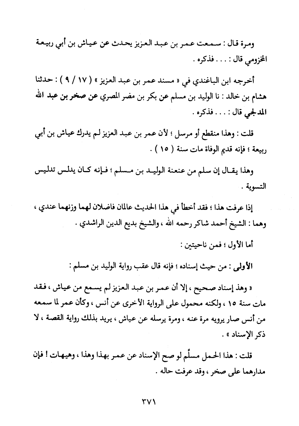 ((وهذا إسناد صحيح، إلا أن عمر بن عبد العزيز لم يسمع من عياش، فقد مات سنة 15، ولكنه محمول على الرواية الأخرى عن أنس، وكأن عمر لما سمعه من أنس صار يرويه مرة عنه، ومرة يرسله عن عياش، يريد بذلك رواية القصة، لا ذكر الإسناد)) .