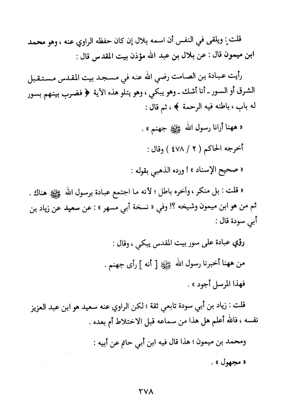 رأيت عبادة بن الصامت رضي الله عنه في مسجد بيت المقدس مستقبل الشرق أو السور - أنا أشك - وهو يبكي، وهو يتلو هذه الآية {فَضُرِبَ بَيْنَهُم بِسُورٍ لَّهُ بَابٌ بَاطِنُهُ فِيهِ الرَّحْمَةُ} ، ثم قال: