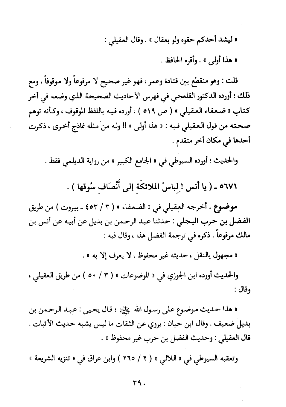 قلت: وهو منقطع بين قتادة وعمر, فهو غير صحيح لا مرفوعا ولا موقوفا, ومع ذلك, أورده الدكتور القلعجي في فهرس الأحاديث الصحيحة الذي وضعه في آخر كتاب ((ضعفاء العقيلي)) (ص 519) , وأورجه فيه باللفظ الموقوف, وكأنه توهم صحته من قول العقيلي فيه: (هذا أولى) ! ! له من مثله نماذج أخرى, وذكرت أحدها في مكان آخر متقدم.