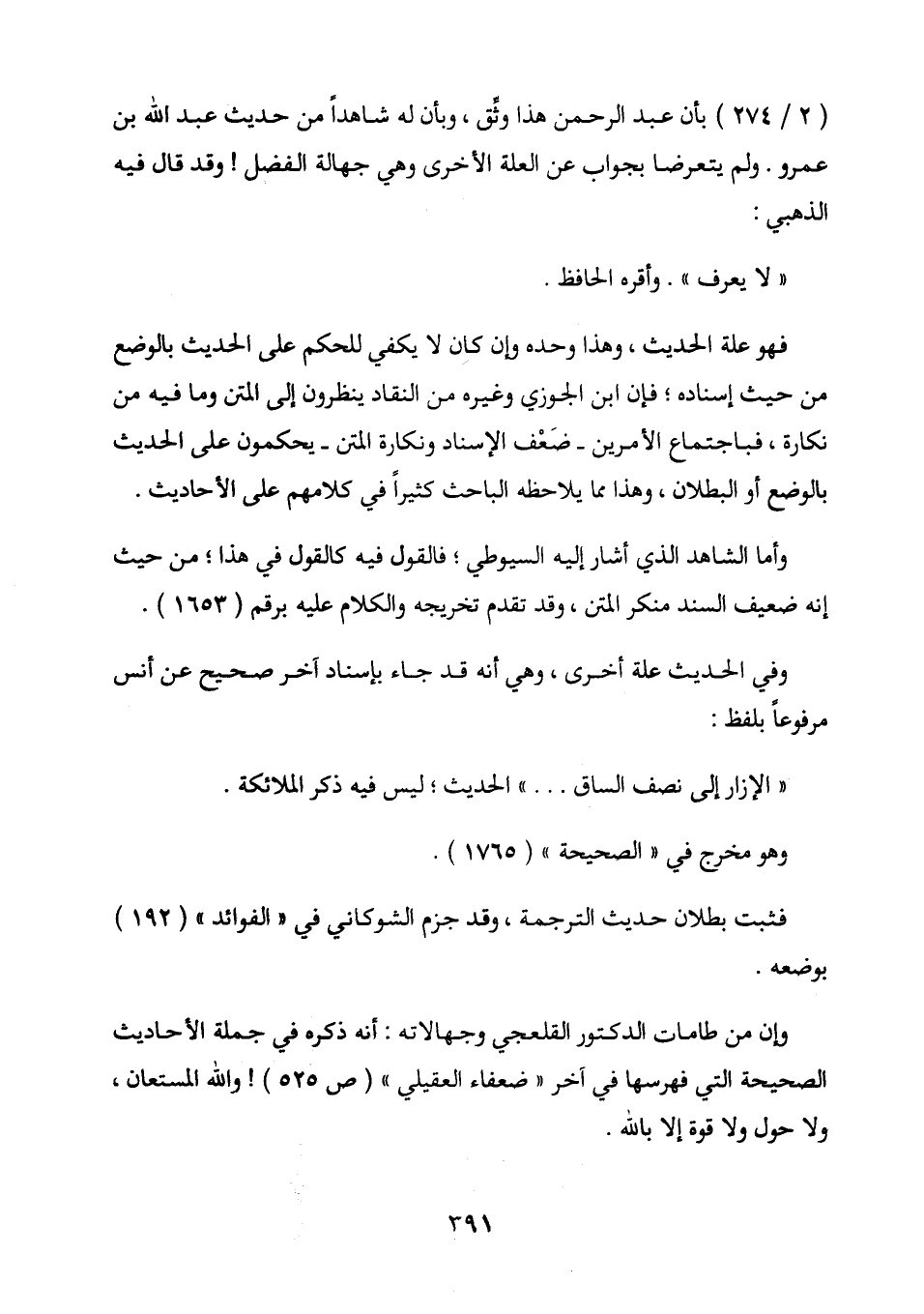 (2 / 274) بأن عبد الرحمن هذا أوثق، وبأن له شاهدا من حديث عبد الله بن عمرو. ولم يتعرضا بجواب عن العلة الأخرى وهى جهالة الفضل! وقد قال فيه الذهبي: