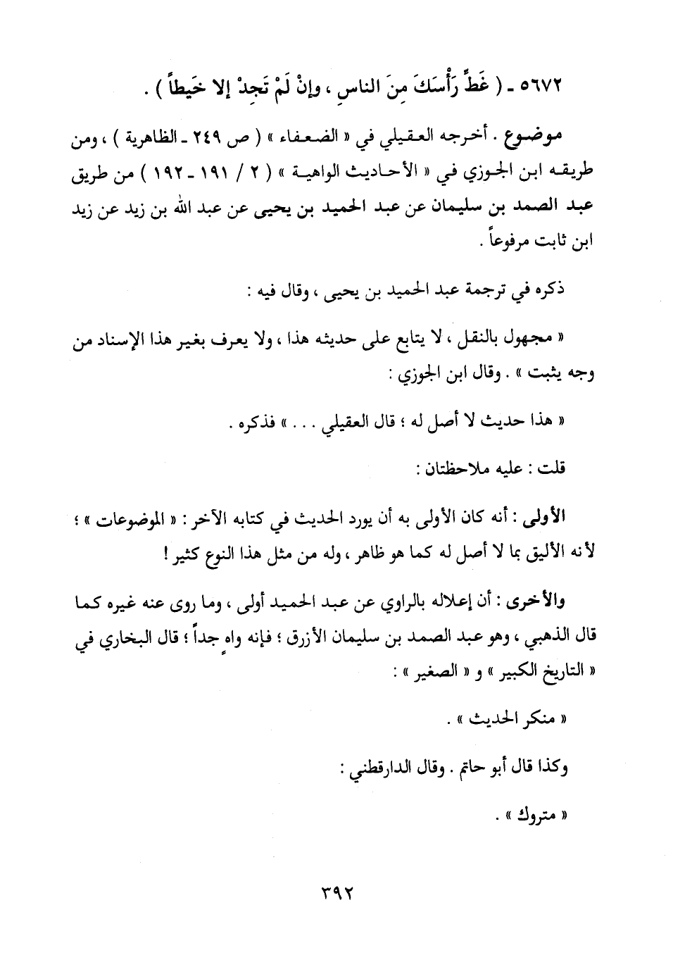 والأخرى: أن إعلاله بالراوى عن عبد الحميد أولى، وما روى عنه غيره كما قال الذهبى، وهو عبد الصمد بن سليمان الأرزرق فإنه واه جدا، قال البخاري فى " التاريخ الكبير " و " الصغير ":