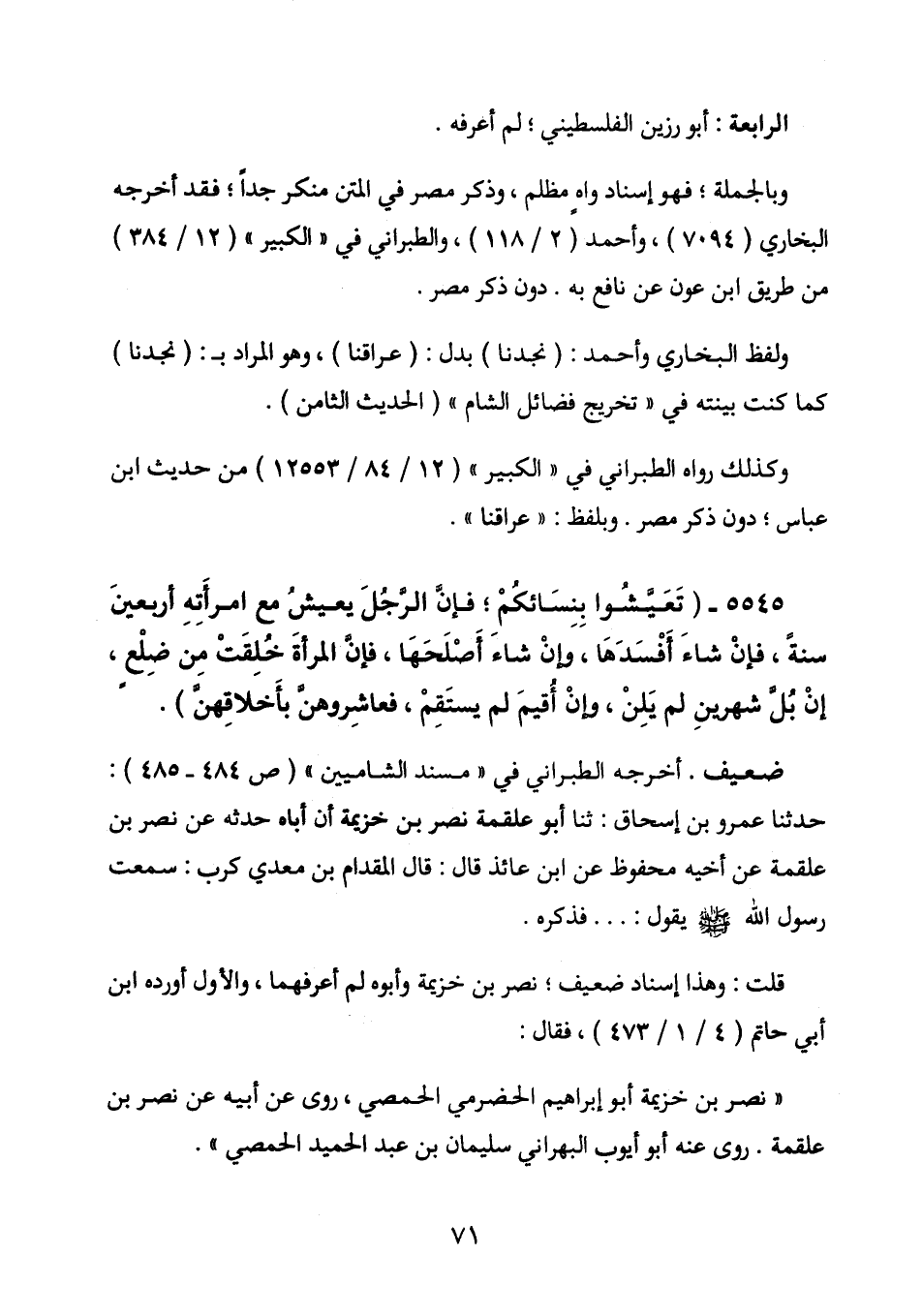 قُلْتُ: وَهَذَا إِسْنَادٌ ضَعِيفٌ. نَصْرُ بْنُ خُزَيْمَةَ وَأَبُوهُ لَمْ أَعْرِفْهُمَا. وَالأَوَّلُ أَوْرَدَهُ ابْنُ أَبِي حَاتِمٍ