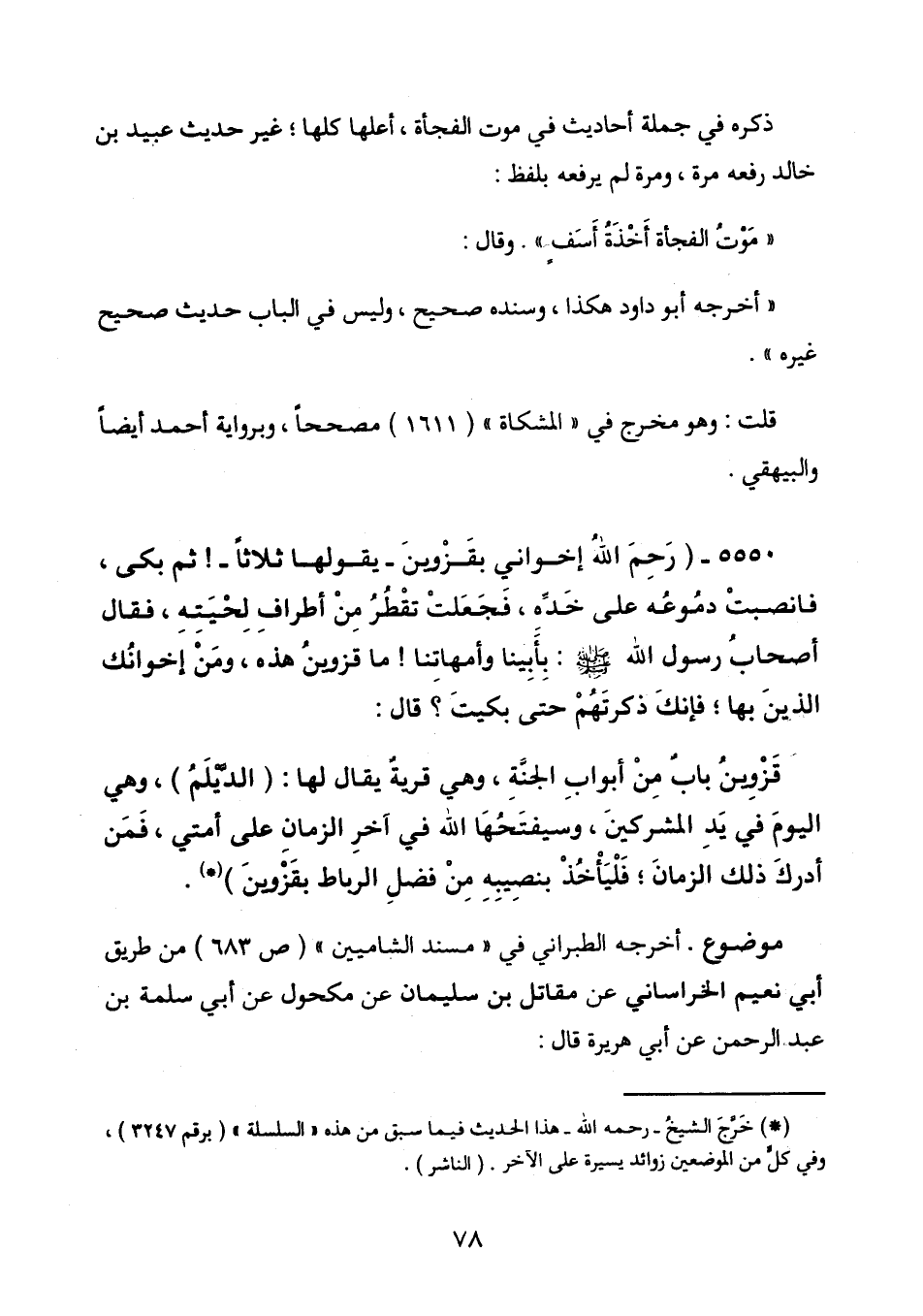 5550 - «رَحِمَ اللهُ إِخْوَانِي بِقَزْوِينَ» يَقُولُهَا ثَلاثَاً، ثُمَّ بَكَى، فَانْصَبَّتْ دُمُوعُهُ عَلَى خَدِهِ، فَجَعَلَتْ تَقْطُرُ مِنْ أَطْرَافِ لِحْيَتِهِ، فَقَالَ أَصْحَابُ رَسُولِ اللهِ صَلَّى اللهُ عَلَيْهِ وَسَلَّمَ: بِآبَائِنَا وَأُمَّهَاتِنَا، مَا قَزْوِينُ هَذِهِ؟ ، وَمَنْ إِخْوَانُكَ الَّذِينَ بِهَا؟ ، فَإِنَّكَ ذَكَرْتُهُمْ هَهُنَا حَتَّى بَكَيْتَ؟ ، قَالَ: «قَزْوِينُ بَابٌ مِنْ أَبْوَابِ الْجَنَّةِ، وَهِيَ قَرْيَةٌ يُقَالُ لَهَا: (الدَّيْلَمُ) ، وَهِيَ الْيَوْمَ فِي يَدِ الْمُشْرِكِينَ، وَسَيَفْتَحُهَا اللهُ فِي آخِرِ الزَّمَانِ عَلَى أُمَّتِي، فَمَنْ أَدْرَكَ ذَلِكَ الزَّمَانَ، فَلْيَأْخُذْ بِنَصِيبِهِ مِنْ قِبَلِ الرِّبَاطِ بِقَزْوِينَ» (1) .