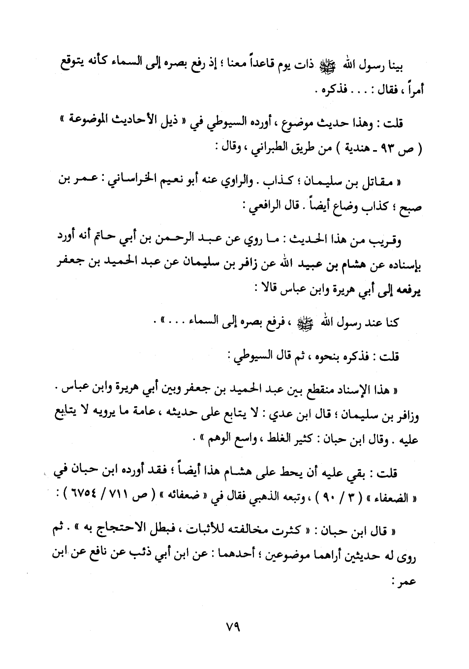 «مُقَاتِلُ بْنُ سُلَيْمَانَ كَذَّابٌ. وَالرَّاوِي عَنْهُ: أَبُو نُعَيْمٍ الْخُرَاسَانِيُّ عُمَرُ بْنُ صُبْحٍ كَذَّابٌ وَضَّاعٌ أَيْضَاً. فَالَ الرَّافِعِيُّ: