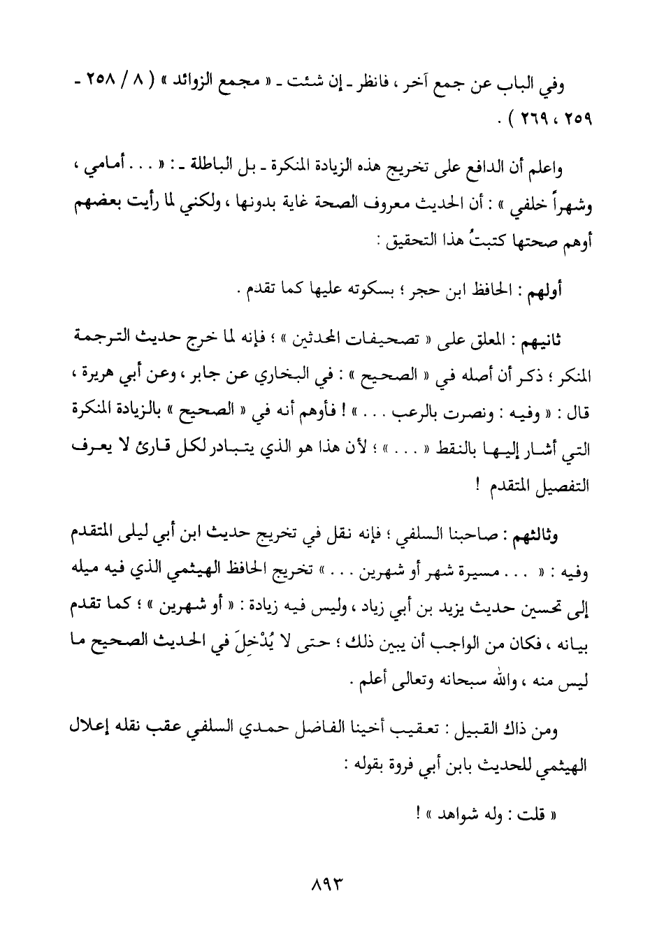 وثالثهم: صاحبنا السلفي؛ فإنه نقل في تخريج حديث ابن أبي ليلى المتقدم وفيه: ((. . . مسيرة شهر أو شهرين. . .)) تخريج الحافظ الهيثمي الذي فيه ميله إلى تحسين حديث يزيد بن أبي زياد، وليس فيه زيادة: ((أو شهرين)) ؛ كما تقدم بيانه، فكان من الواجب أن يبين ذلك؛ حتى لا يُدخل في الحديث الصحيح ما ليس منه، والله سبحانه وتعالى أعلم.