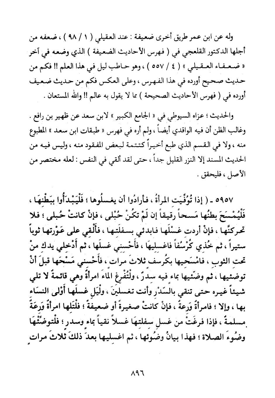5957 - (إذا توفيت المرأة، فأرادوا أن يغسلوها، فليبدأوا ببطنها، فليمسح بطنها مسحاً رقيقاً إن لم تكن حُبلى، فإن كانت حُبلى؛ فلا تحركنها، فإن أردت غسلها فابدئي بسفلتها، فألقي على عورتها ثوباً ستيراً، ثم خذي كرسفاً فاغسليها، فأحسني غسلها، ثم أدخلي يدك من تحت الثوب، فامسحيها بكرسف ثلاث مرات، فأحسني مسحها قبل أن توضئيها، ثم وضئيها بماء فيه سدر، ولتفرغ الماء امرأة وهي قائمة لا تلي شيئاً غيره حتى تنقي بالسدر وأنت تغسلين، وليل غسلها أولى النساء بها، وإلا؛ فامرأة ورعة، فإن كانت صغيرة أو ضعيفة؛ فلتلها امرأة ورعة مسلمةٌ، فإذا فرغت من غسل سفلتها غسلاً نقياً بماء وسدر؛ فلتوضئها وضوء الصلاة؛ فهذا بيان وضوئها، ثم اغسليها بعد ذلك ثلاث مرات