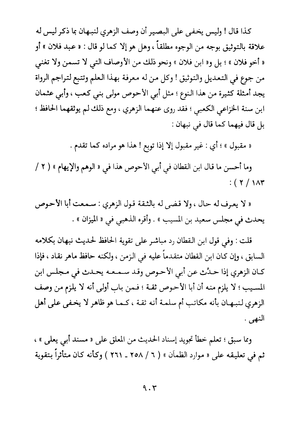 قلت: وفي قول ابن القطان رد مباشر على تقوية الحافظ لحديث نبهان بكلامه السابق، وإن كان ابن القطان متقدماً عليه في الزمن، ولكنه حافظ ماهر نقاد، فإذا كان الزهري إذا حَدَّثَ عن أبي الأحوص وقد سمعه يحدث في مجلس ابن المسيب؛ لا يلزم منه أن أبا الأحوص ثقة؛ فمن باب أولى أنه لا يلزم من وصف الزهري لنبهان بأنه مكاتب أم سلمة أنه ثقة، كما هو ظاهر لا يخفى على أهل النهى.