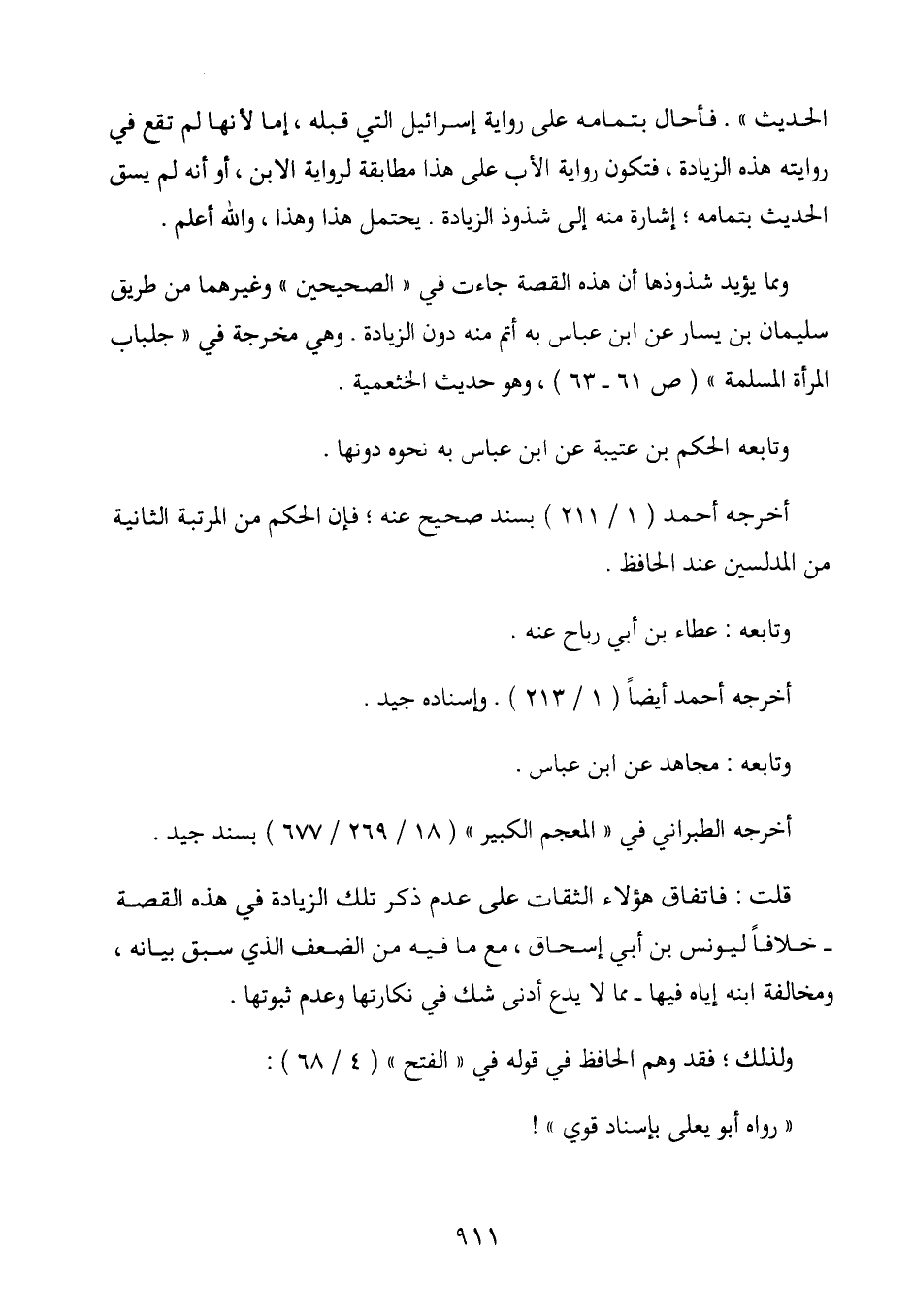 ومما يؤيد شذوذها أن هذه القصة جاءت في " الصحيحين " وغيرهما من طريق سليمان بن يسار عن ابن عباس به أتم منه دون الزيادة. وهي مخرجة في " جلباب المرأة المسلمة " (ص 61 - 63) ، وهو حديث الخثعمية.