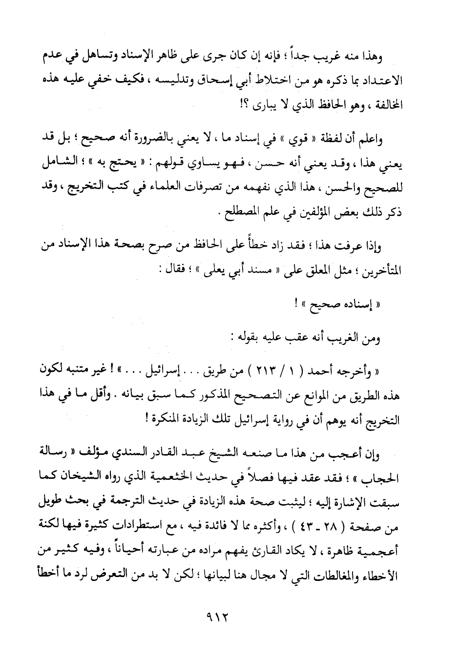 وإن أعجب من هذا ما صنعه الشيخ عبد القادر السندي مؤلف " رسالة الحجاب "؛ فقد عقد فيها فصلاً في حديث الخثعمية الذي رواه الشيخان كما سبقت الإشارة إليه؛ ليثبت صحة هذه الزيادة في حديث الترجمة في بحث طويل من صفحة (28 - 43) ، وأكثره مما لا فائدة فيه، مع استطرادات كثيرة فيها لكنة أعجمية ظاهرة، لا يكاد القارئ يفهم مراده من عبارته أَحْيَانًا، وفيه كثير من الأخطاء والمغالطات التي لا مجال هنا لبيانها؛ لكن لا بد من التعرض لرد ما أخطأ