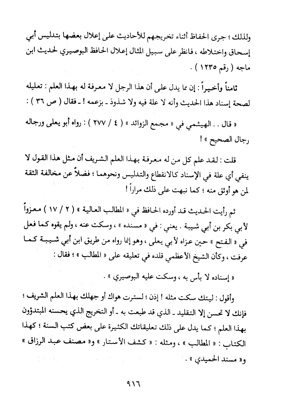 وأقول: ليتك سكت مثله! إذن؛ لسترت هواك أو جهلك بهذا العلم الشريف؛ فإنك لا تحسن إلا التقليد - الذي قد طبعت به - أو التخريج الذي يحسنه المبتدؤون بهذا العلم؛ كما يدل على ذلك تعليقاتك الكثيرة على بعض كتب السنة؛ كهذا الكتاب: " المطالب "، ومثله: " كشف الأستار " و " مصنف عبد الرزاق " و " مسند الحميدي ".