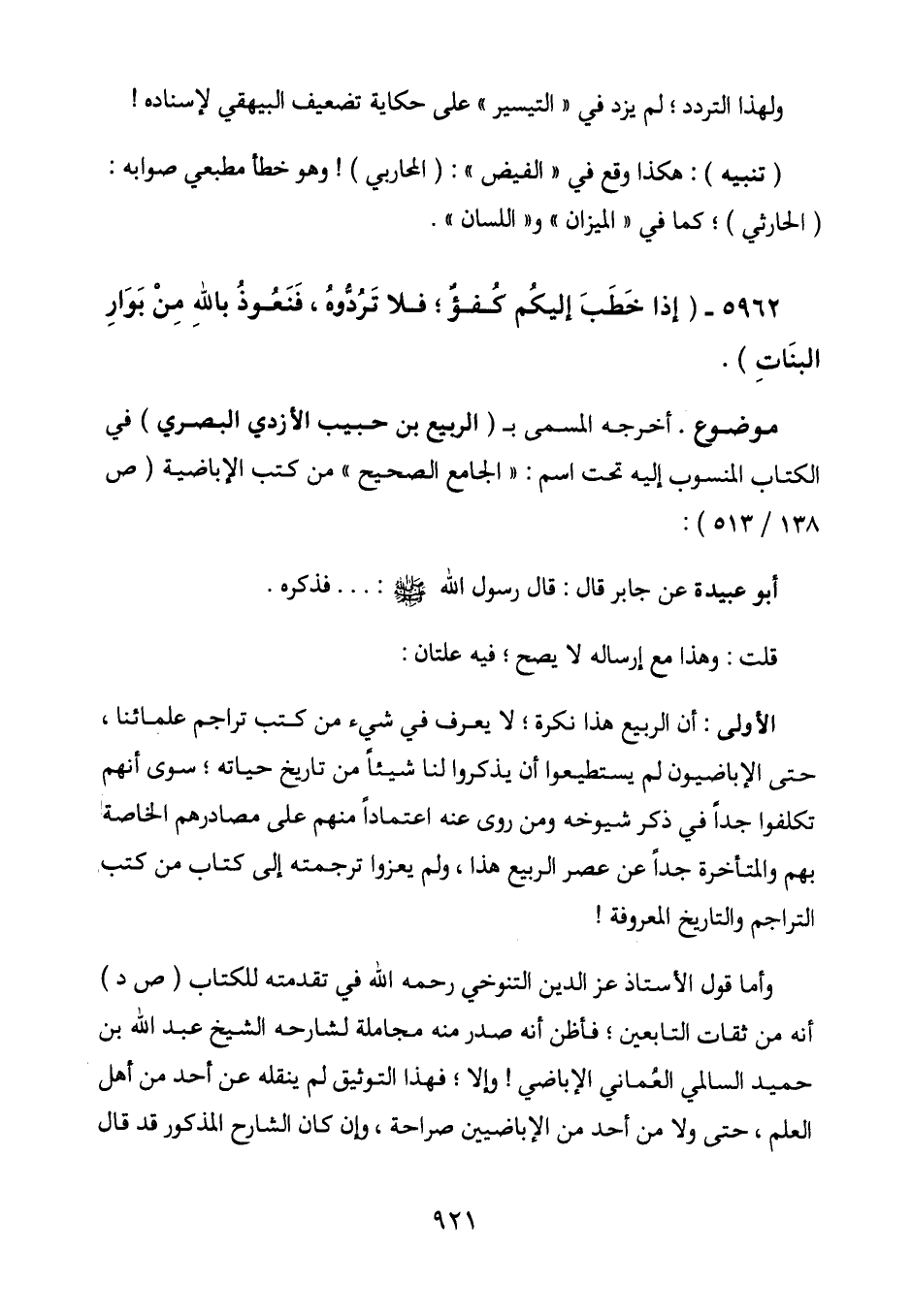 الأولى: أن الربيع هذا نكرة؛ لا يعرف في شيء من كتب تراجم علمائنا، حتى الإباضيون لم يستطيعوا أن يذكروا لنا شَيْئًا من تاريخ حياته؛ سوى أنهم تكلفوا جِدًّا في ذكر شيوخه ومن روى عنه اِعْتِمَادًا منهم على مصادرهم الخاصة بهم والمتأخرة جِدًّا عن عصر الربيع هذا، ولم يعزوا ترجمته إلى كتاب من كتب التراجم والتاريخ المعروفة!