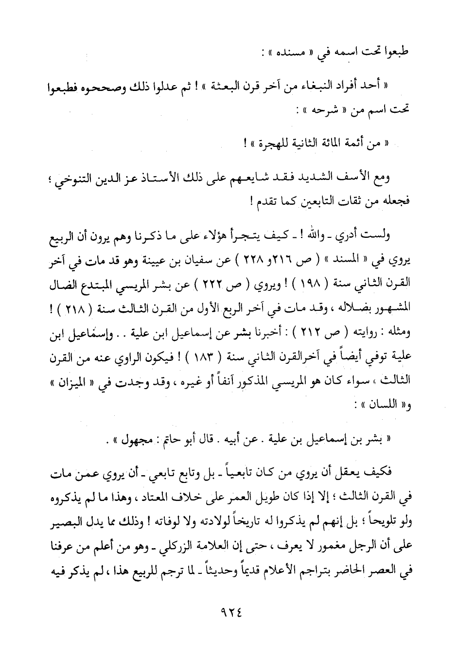 يروي في " المسند " (ص 216 و 228) عن سفيان بن عيينة وهو قد مات في آخر القرن الثاني سنة (198) ! ويروي (ص 222) عن بشر المريسي المبتدع الضال المشهور بضلاله، وقد مات في آخر الربع الأول من القرن الثالث سنة (218) ! ومثله: روايته (ص 212) : أخبرنا بشر عن إسماعيل ابن علية. . وَإِسْمَاعِيل ابن علية توفي أيضاً في آخر القرن الثاني سنة (183) ! فيكون الراوي عنه من القرن الثالث، سواء كان هو المريسي المذكور آنِفاً أو غيره، وقد وجدت في " الميزان " و " اللسان ":