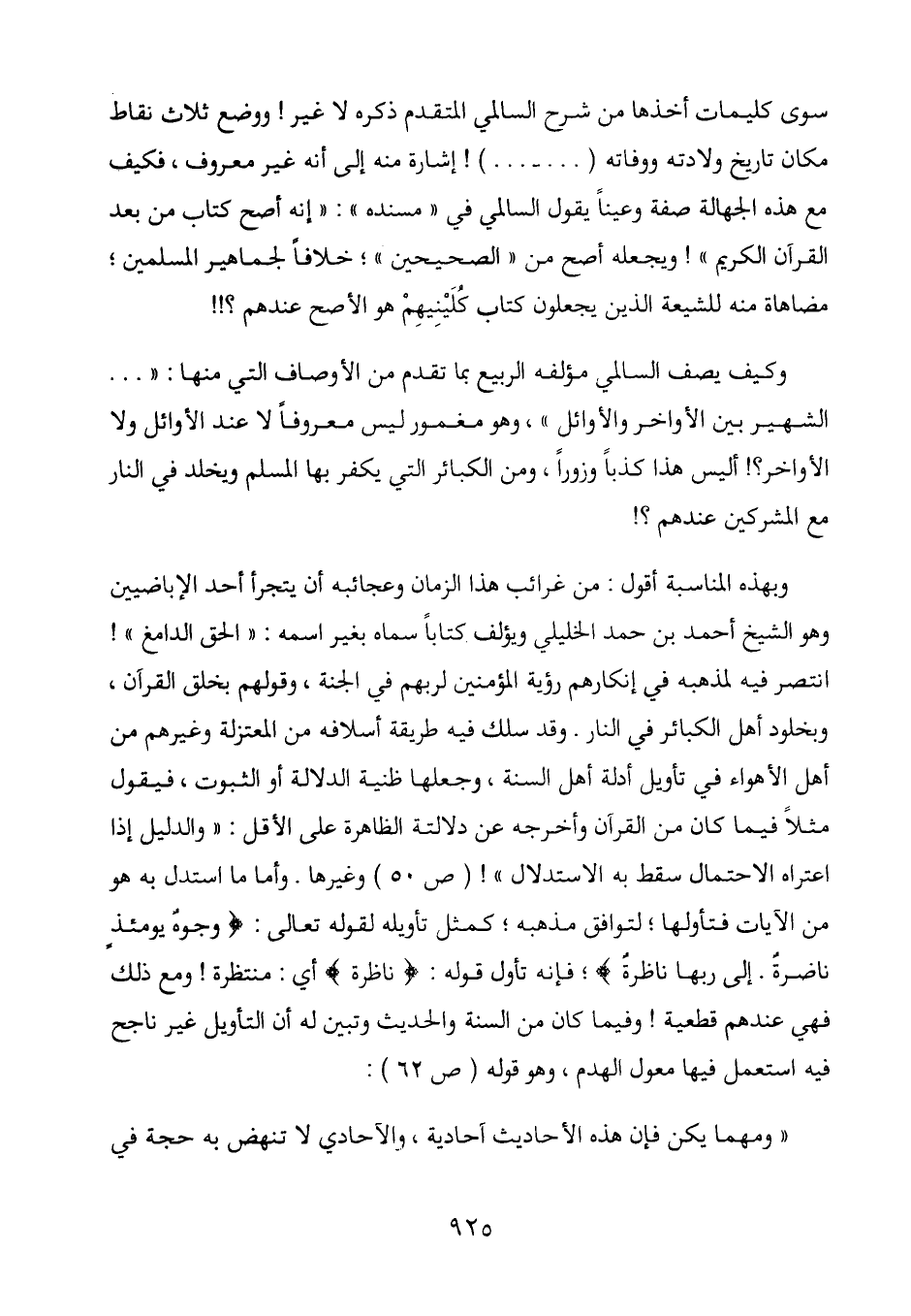 وهو الشيخ أحمد بن حمد الخليلي ويؤلف كِتَاباً سماه بغير اسمه: " الحق الدامغ "! انتصر فيه لمذهبه في إنكارهم رؤية المؤمنين لربهم في الجنة، وقولهم بخلق القرآن، وبخلود أهل الكبائر في النار. وقد سلك فيه طريقة أسلافه من المعتزلة وغيرهم من أهل الأهواء في تأويل أدلة أهل السنة، وجعلها ظنية الدلالة أو الثبوت، فيقول مَثَلاً فيما كان من القرآن وأخرجه عن دَلَالَته الظاهرة على الأقل: " والدليل إذا اعتراه الاحتمال سقط به الاستدلال "! (ص 50) وغيرها. وأما ما استدل به هو من الآيات فتأولها؛ لتوافق مذهبه؛ كمثل تأويله لقوله تعالى: (وجوه يومئذ ناضرة. إلى ربها ناظرة) ؛ فإنه تأول قوله. (ناظرة) أي: منتظرة! ومع ذلك فهي عندهم قطعية! وفيما كان من السنة والحديث وتبين له أن التأويل غير ناجح فيه استعمل فيها معول الهدم، وهو قوله (ص 62) :