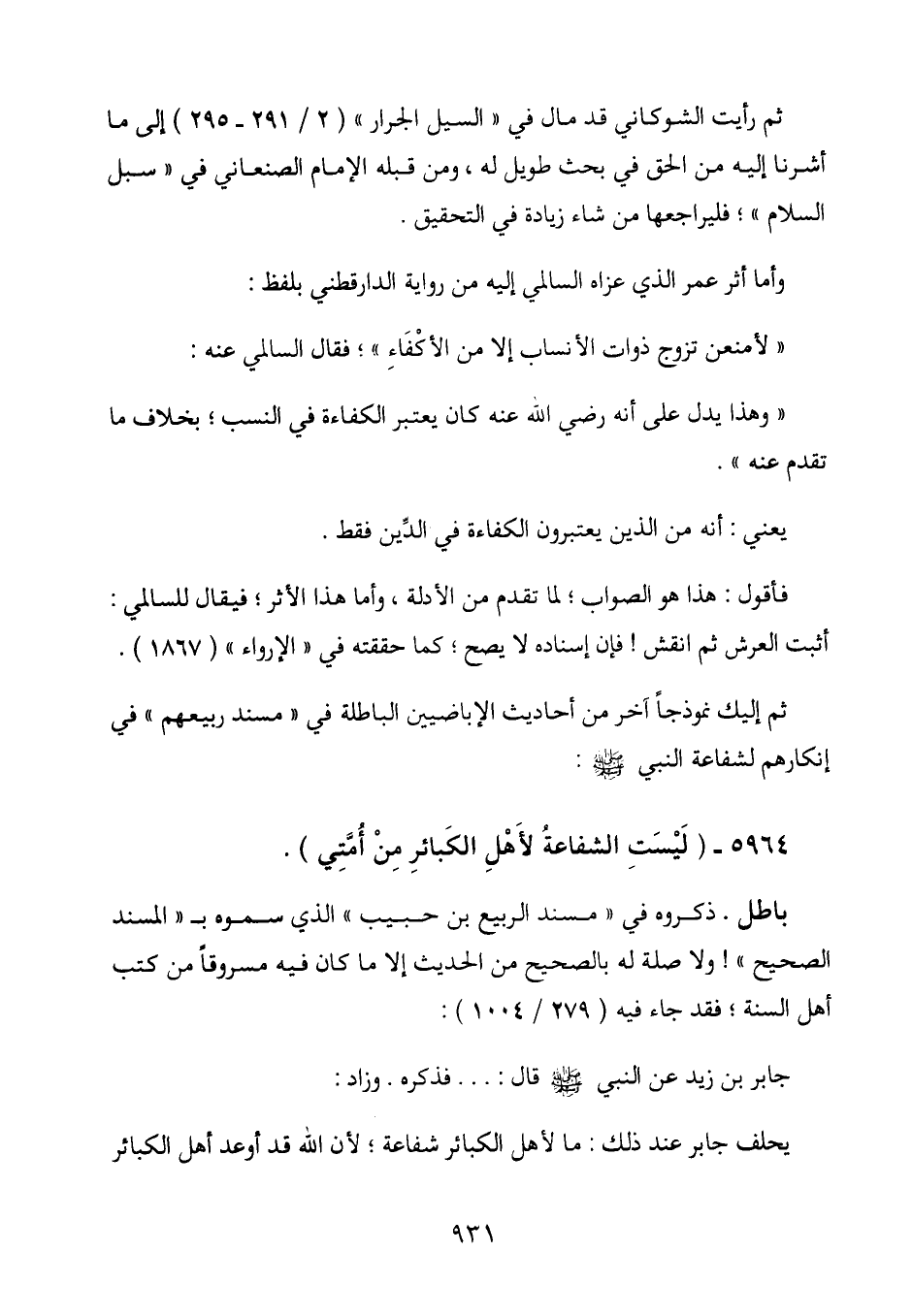 فأقول: هذا هو الصواب؛ لما تقدم من الأدلة، وأما هذا الأثر؛ فيقال للسالمي: أثبت العرش ثم انقش! فإن إسناده لا يصح؛ كما حققته في " الإرواء " (1867) . ثم إليك نَمُوذَجًا آخر من أحاديث الإباضيين الباطلة في " مسند ربيعهم " في إنكارهم لشفاعة النبي صلى الله عليه وسلم: