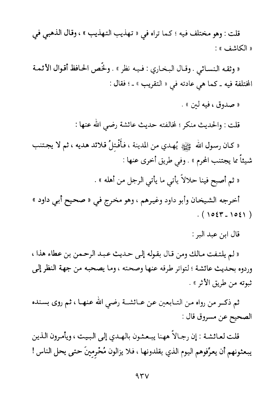 " كان رسول صلى الله عليه وسلم يُهدي من المدينة، فأفتل قلائد هديه، ثم لا يجتنب شَيْئًا مما يجتنب المحرم ". وفي طريق أخرى عنها: