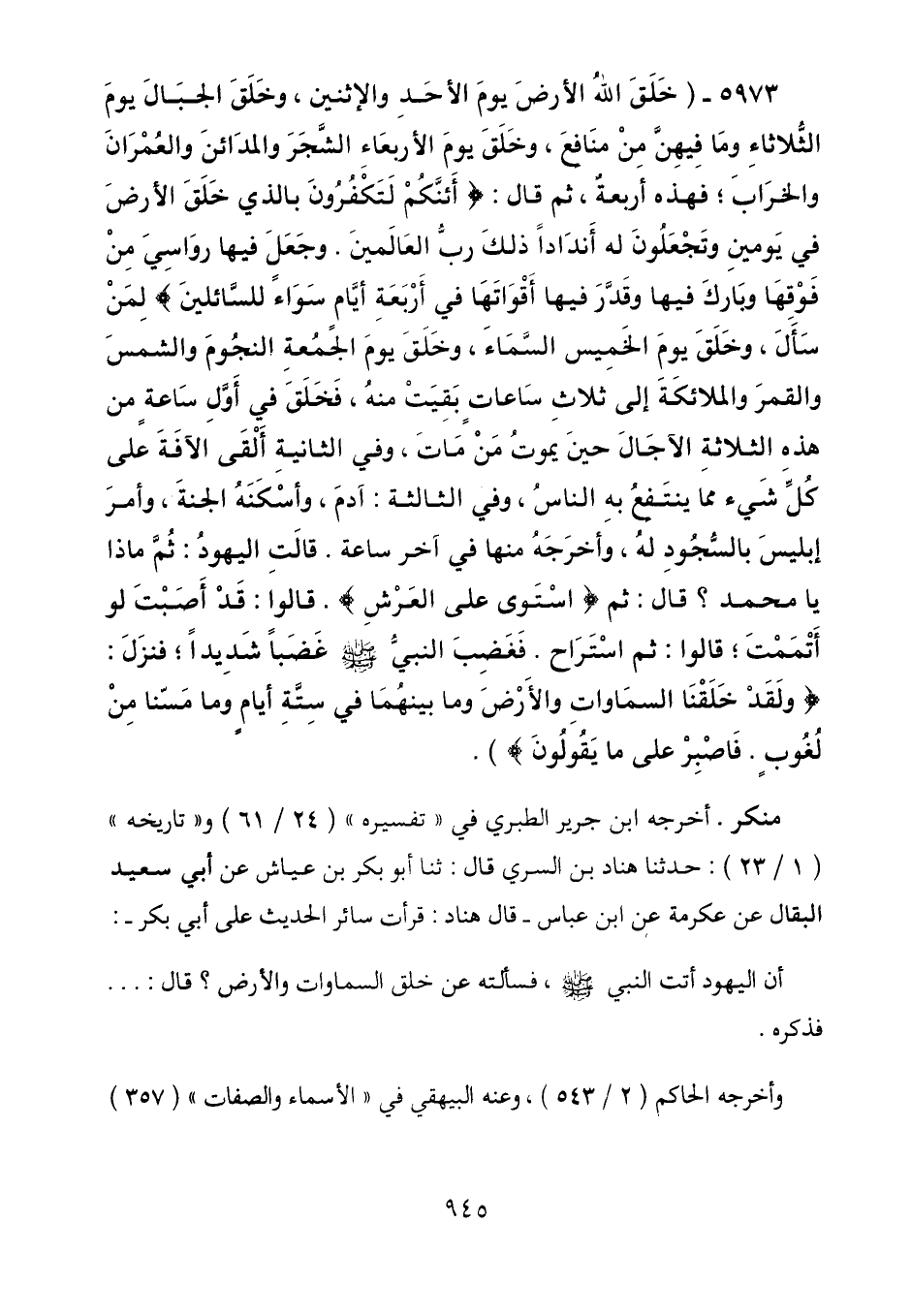 5973 - (خلق اَللَّه الأرض يوم الأحد! والإثنين، وخلق الجبال يوم الثلاثاء وما فيهنّ من منافع، وخلق يوم اَلْأَرْبِعَاء الشّجر وَالْمَدَائِن والعمران والخراب؛ فهذه أربعة، ثم قال: (أئنكم لتكفرون بالذي خلق الأرض في يومين وتجعلون له أنداداً ذلك ربّ العالمين. وجعل فيها رواسي من فوقها وبارك فيها وقدّر فيها أقواتها في أربعة أيام سواءً لِلسَّائِلِينَ) لمن سأل، وخلق يوم اَلْخَمِيس السماء، وخلق يوم الجمعة النجوم والشمس والقمر والملائكة إلى ثلاث سَاعَات بقيت منه، فخلق في أوّل ساعة من هذه الثلاثة الآجال حين يَمُوت من مات، وفي الثانية ألقى اَلْآفَة على كل شَيْء مما يَنْتَفِع به اَلنَّاس، وفي الثالثة: آدم، وأسكنه الجنة، وَأَمَرَ إبليس! بالسجود لَهُ، وَأَخْرَجَهُ منها في آخر ساعة. قالت اَلْيَهُود: ثُمَّ ماذا يا محمد؛ قال: ثم (اِسْتَوَى على العرش) . قالوا: قد أصبت لو أتممت؛ قالوا: ثم اِسْتَرَاحَ. فغضب اَلنَّبِيّ صلى الله عليه وسلم غضباً شديداً؛ فنزل: (ولقد خلقنا السماوات وَالْأَرْض وما بينهم في ستّة أيام وما مسّنا من لُغوب. فاصبر على ما يَقُولُونَ))