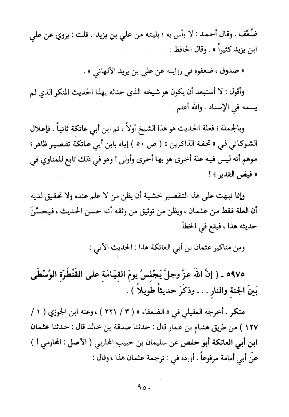 5975 - (إن اَللَّه عزّ وجلّ يَجْلِسُ يوم القيامة على القنطرة الوسطى بين الجنة والنار. . . وذكر حَدِيثاً طَوِيلًا) .