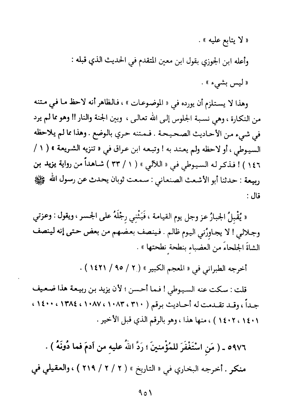 من النكارة، وهي نسبة الجلوس إلى الله تعالى، وبين الجنة والنار! ! وهو مما لم يرد في شيء من الأحاديث الصحيحة. فمتنه حري بالوضع. وهذا مما لم يلاحظه السيوطي، أو لاحظه ولم يعتد به! وتبعه ابن عراق في " تنزيه الشريعة " (1 / 946) ! فذكر له السيوطي في " اللآلئ " (1 / 33) شَاهَدَا من رواية يزيد بن ربيعة: حدثنا أبو الأشعث الصنعاني: سمعت ثوبان يحدث عدت رسول الله صلى الله عليه وسلم قال: