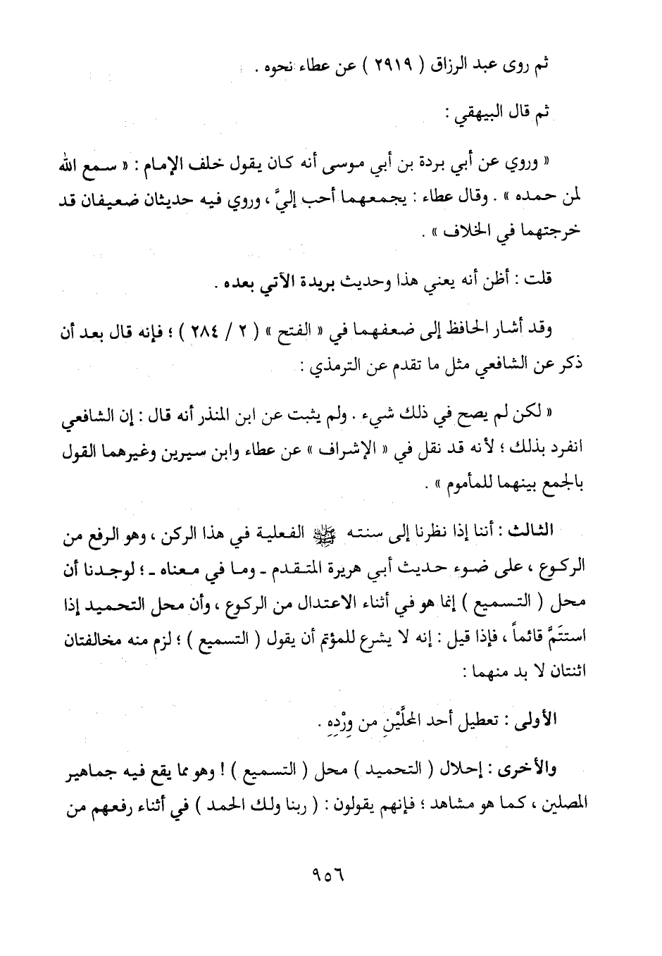 الثالث: أننا إذا نظرنا إلى سنته صلى الله عليه وسلم الفعلية في هذا الركن، وهو الرفع من الركوع، على ضَوْء حديث أبي هريرة المتقدم - وما في معناه -؛ لوجدنا أن محل (التسميع) إنما هو في أثناء الاعتدال من الركوع، وأن محل التحميد إذا استتم قَائِمًا، فإذا قيل: إنه لا يشرع للمؤتم أن يقول (التسميع) ؛ لزم منه مخالفتان