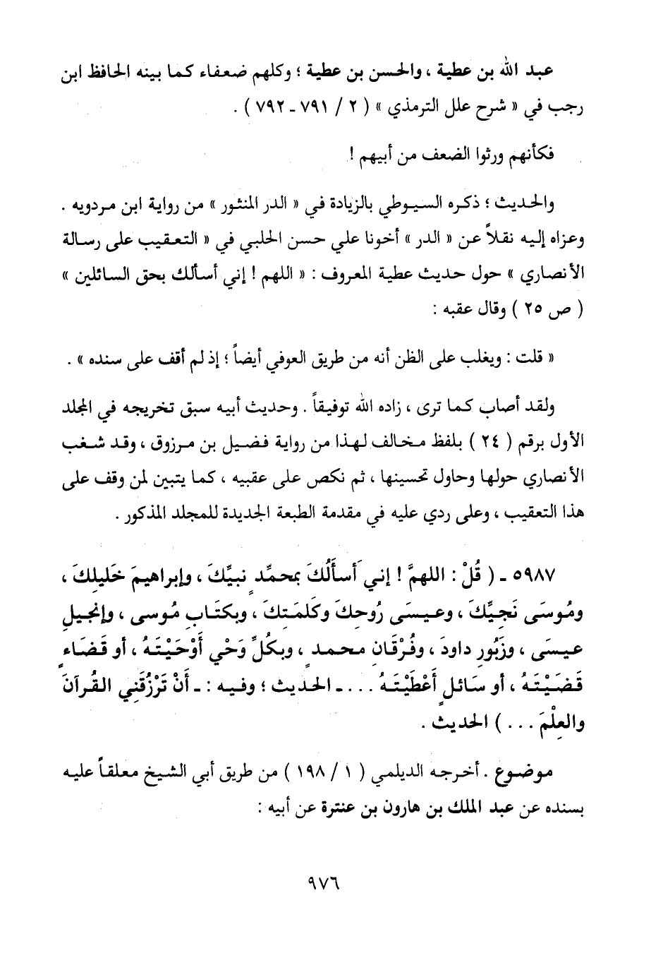والحديث؛ ذكره السيوطي بالزيادة في " الدر المنثور " من رواية ابن مِرْوَدَيْهِ. وعزاه إليه نَقْلًا عن " الدر " أخونا علي حسن الحلبي في " التعقيب على رسالة اَلْأَنْصَاريّ " حول حديث عطية المعروف: " اللهم! إني أسألك بحق السائلين "