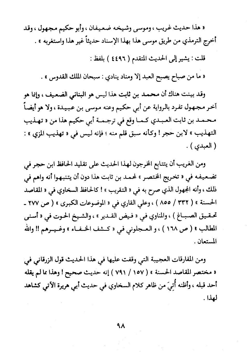 ومن الغريب أن يتتابع المخرجون لهذا الحديث على تقليد الحافظ بن حجر في تضعيفه في ((تخريج المختصر)) لمحمد بن ثابت هذا دون أن يتنبهوا أنه واهم في ذلك، وأنه المجهول الذي صرح به في ((التقريب)) ! كالحافظ السخاوي في ((المقاصد الحسنة)) (332 / 855) ، وعلى القاري في ((الموضوعات الكبرى)) (ص 277 - تحقيق الصباغ) ، والمناوي في ((فيض القدير)) ، والشيخ الحوت في ((أسنى المطالب))