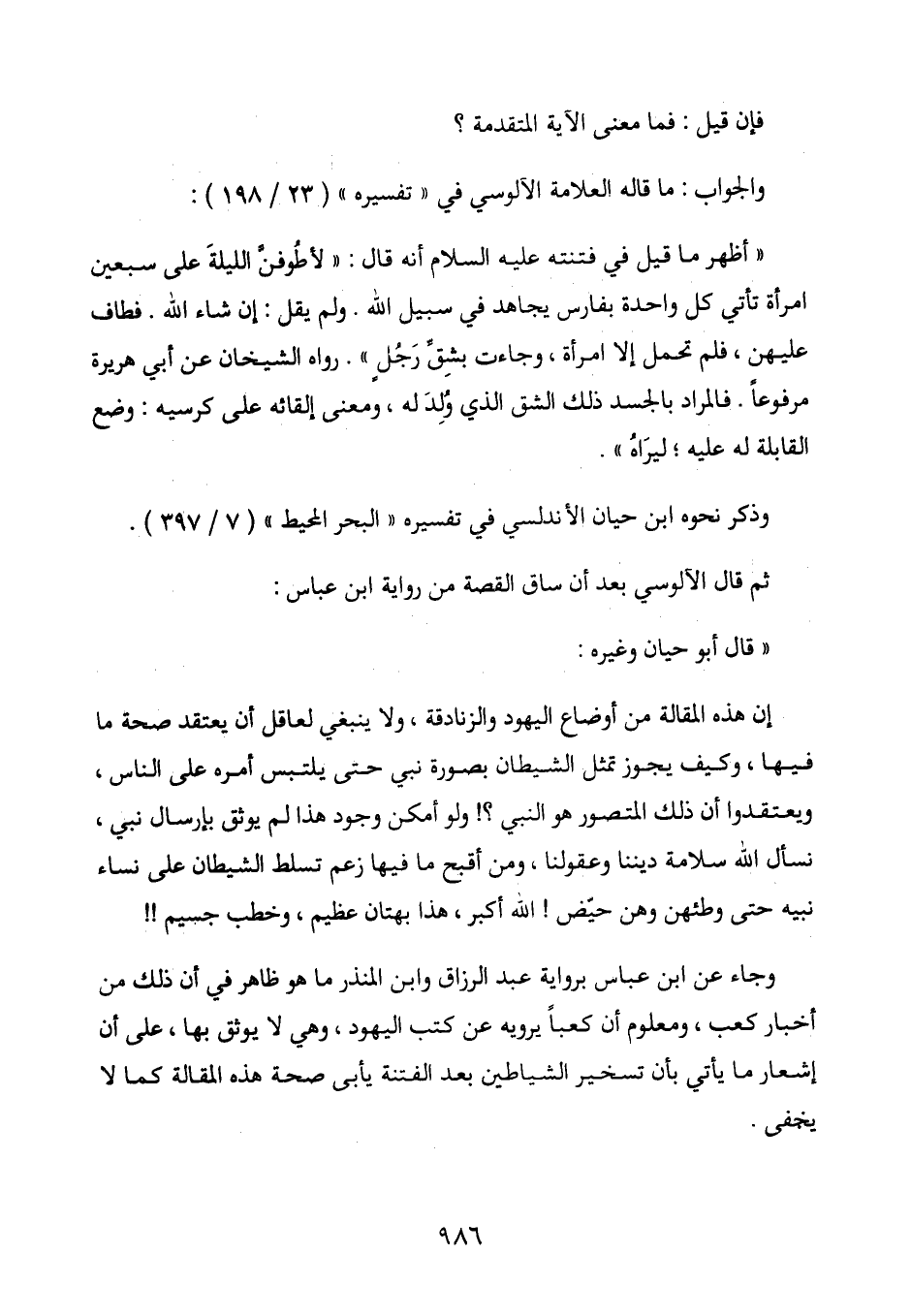 إن هذه المقالة من أوضاع اليهود والزنادقة، ولا ينبغي لعاقل أن يعتقد صحة ما فيها، وكيف يجوز تمثل الشيطان بصورة نبي حتى يلتبس أمره على الناس، ويعتقدوا أن ذلك المتصور هو النبي؟ ! ولو أمكن وجود هذا لم يوثق بإرسال نبي، نسأل الله سلامة ديننا وعقولنا، ومن أقبح ما فيها زعم تسلط الشيطان على نساء نبيه حتى وطئهن وهن حيض! الله أكبر، هذا بهتان عظيم، وخطب جسيم ا! وجاء عن ابن عباس برواية عبد الرزاق وابن المنذر ما هو ظاهر في أن ذلك من أخبار كعب، ومعلوم أن كَعْباً يرويه عن كتب اليهود، وهي لا يوثق بها، على أن إشعار ما يأتي بأن تسخير الشياطين بعد الفتنة يأبى صحة هذه المقالة كما لا يخفى.