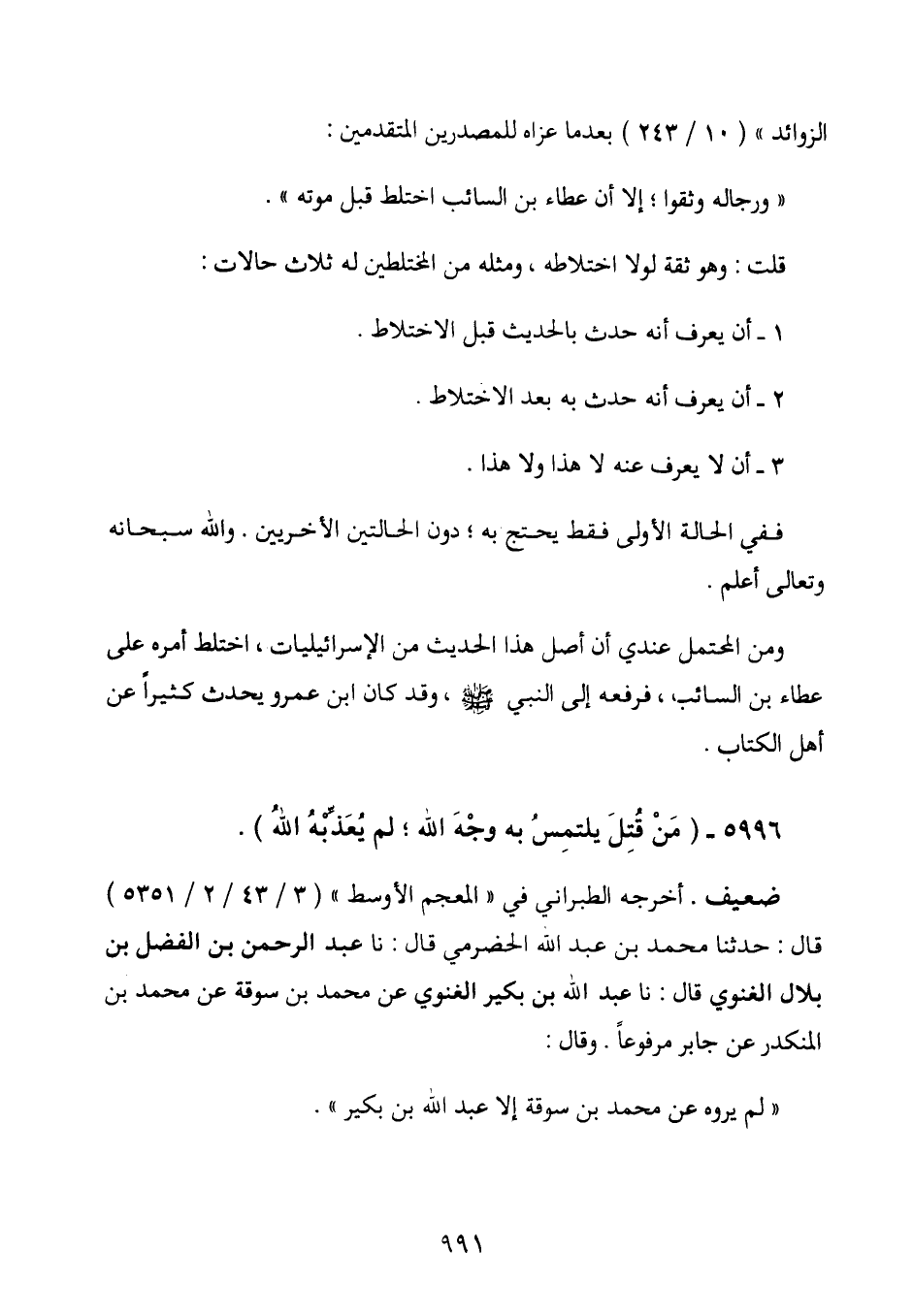 ومن المحتمل عندي أن أصل هذا الحديث من الإسرائيليات، اختلط أمره على عطاء بن السائب،، فرفعه إلى النبي صلى الله عليه وسلم، وقد كان ابن عمرو يحدث كَثِيرًا عن أهل الكتاب.