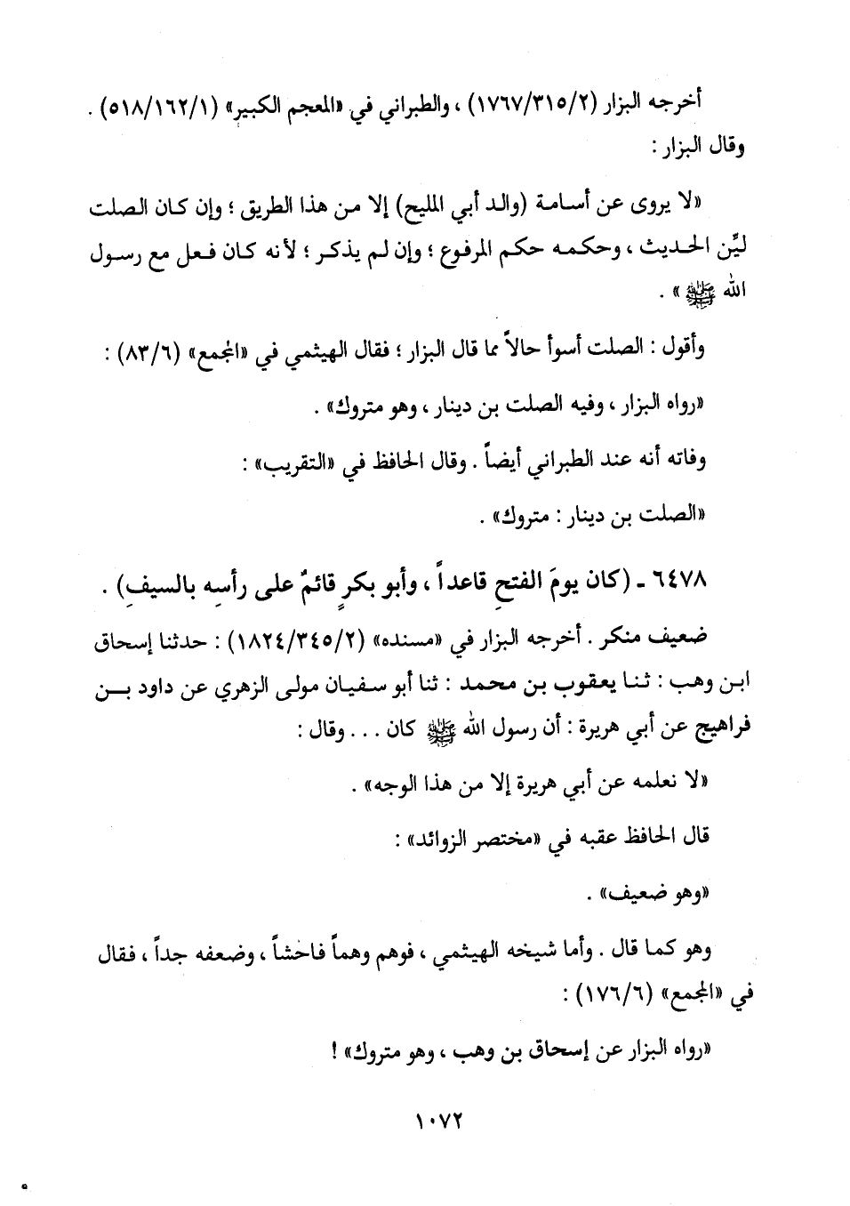 "رواه البزار عن إسحاق بن وهب، وهو متروك"!