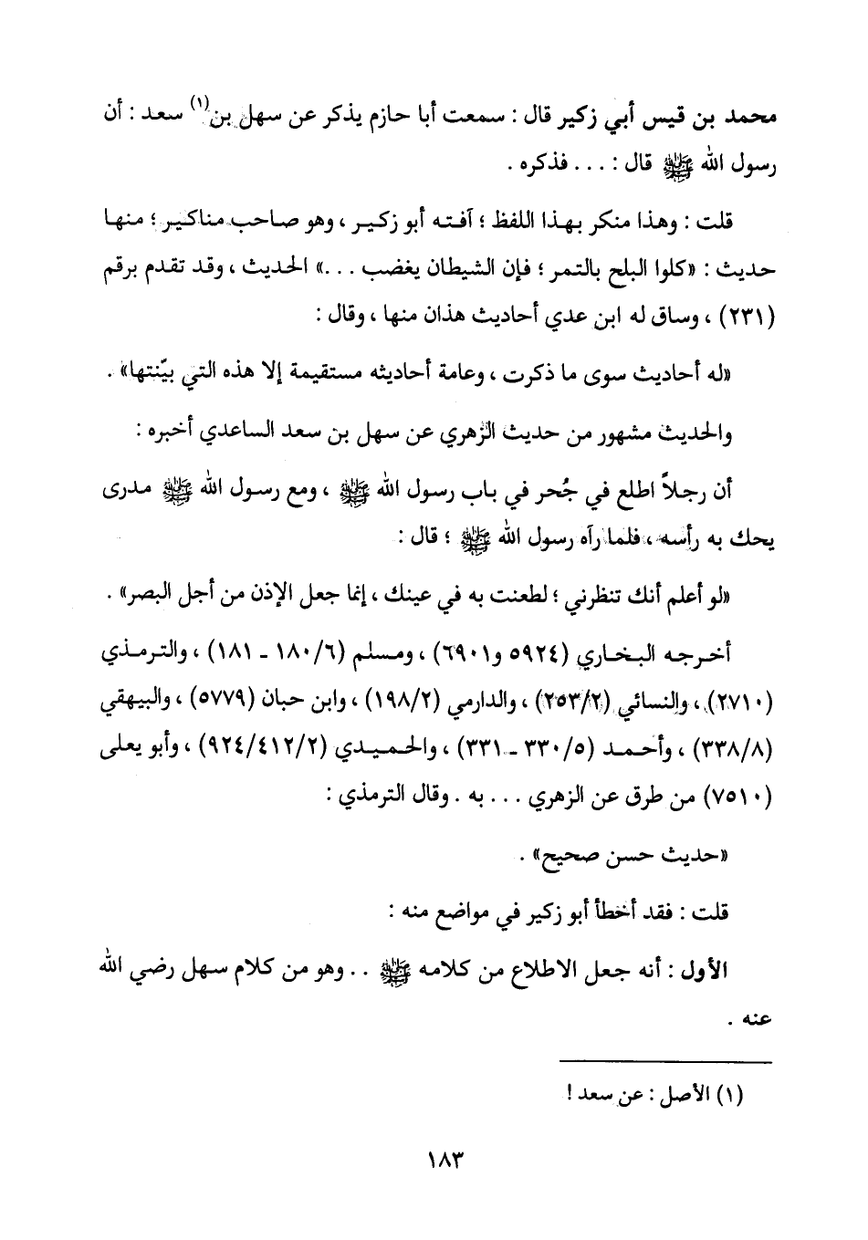 الأول: أنه جعل الاطلاع من كلامه صَلَّى اللَّهُ عَلَيْهِ وَسَلَّمَ ... وهو من كلام سهل رضي الله