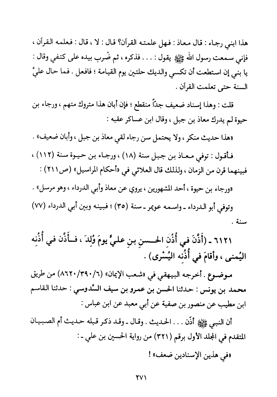 "هذا حديث منكر، ولا يحتمل سن رجاء لقي معاذ بن جبل، وأبان ضعيف ".